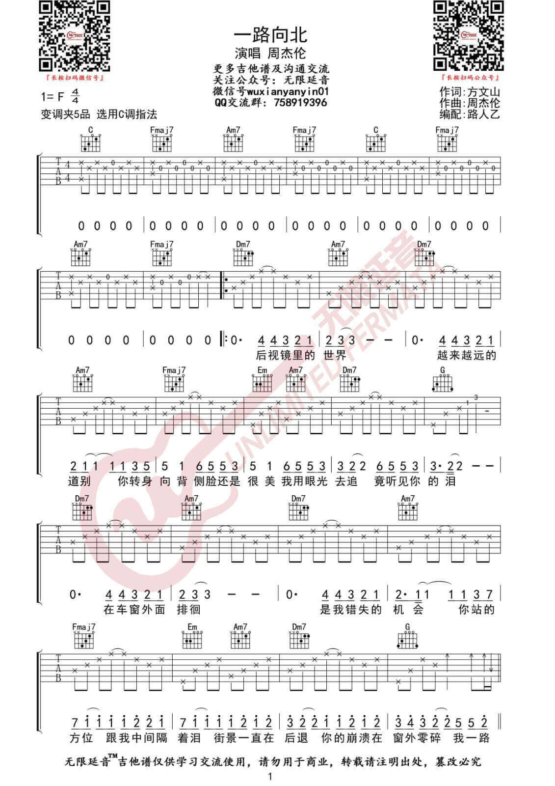 曲谱介绍: 一路向北吉他谱采用了C调指法,由无限延音编配完成。