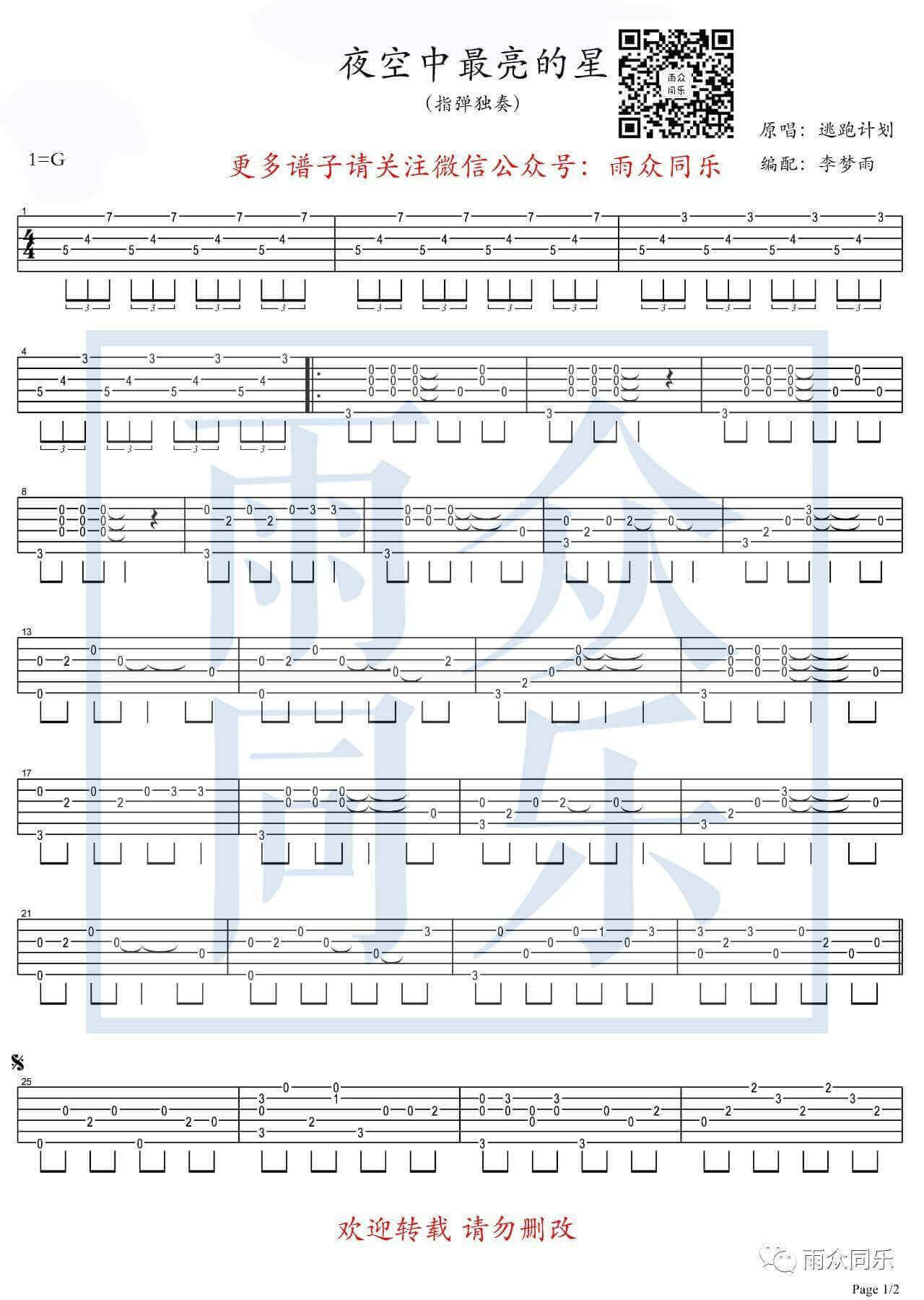 曲谱介绍: 夜空中最亮的星指弹谱由雨众同乐编配完成。夜空中最亮的星这首歌我听过很多种版本,我每次听到不同的声音都会有不同的感受,但是唯一相同的是这首歌传递出来的能力是一样火热有希望的。