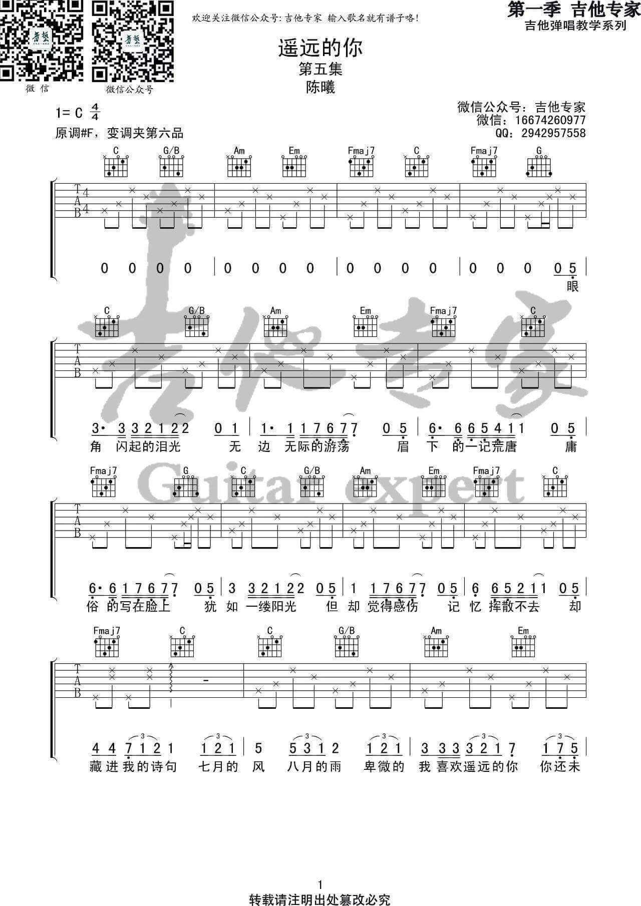 遥远的你吉他谱 - 陈曦 - C调吉他弹唱谱