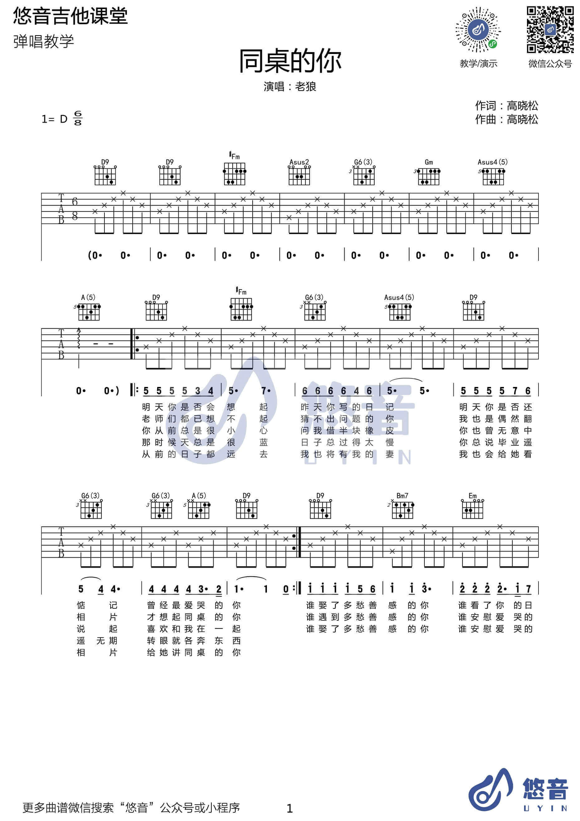 同桌的你吉他谱 - 老狼 - D调吉他弹唱谱
