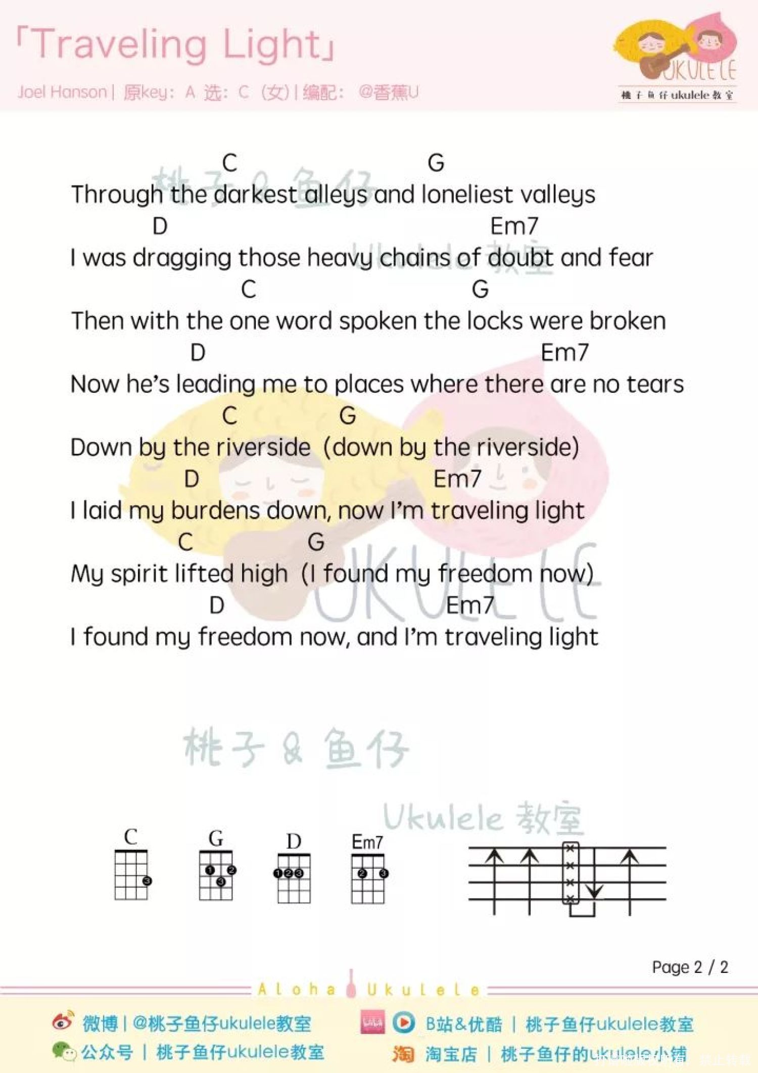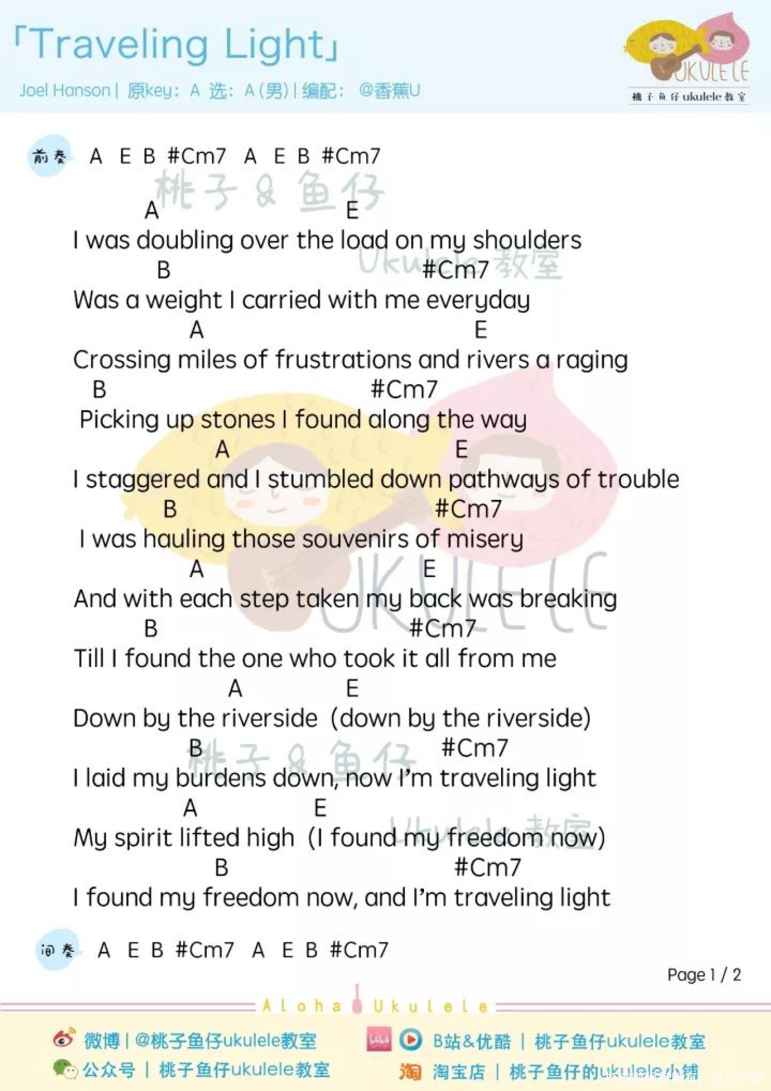 曲谱介绍: 关 于 歌 曲 ●《Traveling Light》(《轻装前行》),发行时间为2002年,是歌手Joel Hanson&Sara Groves演唱的乡村风格歌曲,收录于专辑《what If it is》中。 ●Joel Hanson和Sara Groves都是乡村歌手,Joel 在与Sara Groves合作前发行过两张专辑《broken》和《Interview》。与Sara Groves合作的第一支单曲就是《Traveling Light》并因此而大获成功。 这是一首比较清新和轻松的乡村音乐,干净的吉他,简单的配乐,充满积极向上精神的歌词,都让人心情开朗。喜欢joel hanson恰如其分的嗓音,更喜欢sara groves天籁般的假音。放下身上的负担,一起跟着这首歌的旋律去旅行吧!   尤克里里弹唱教学   尤克里里谱 1、女声版   2、男声版