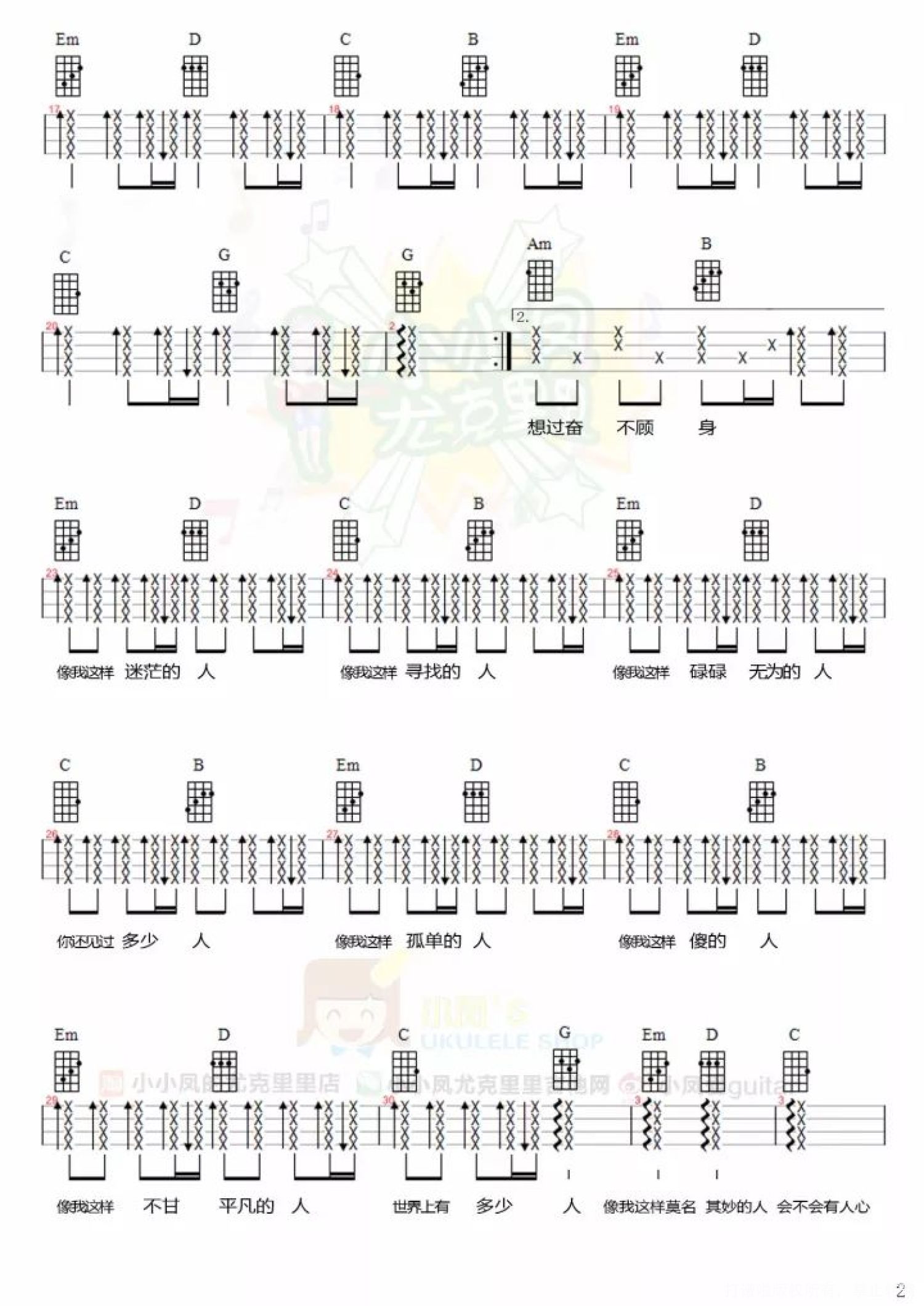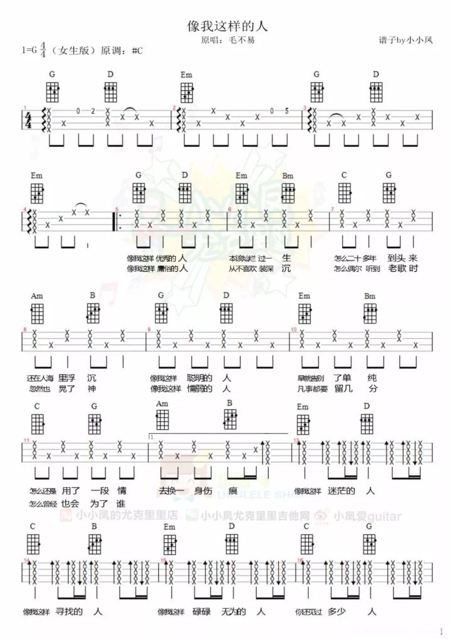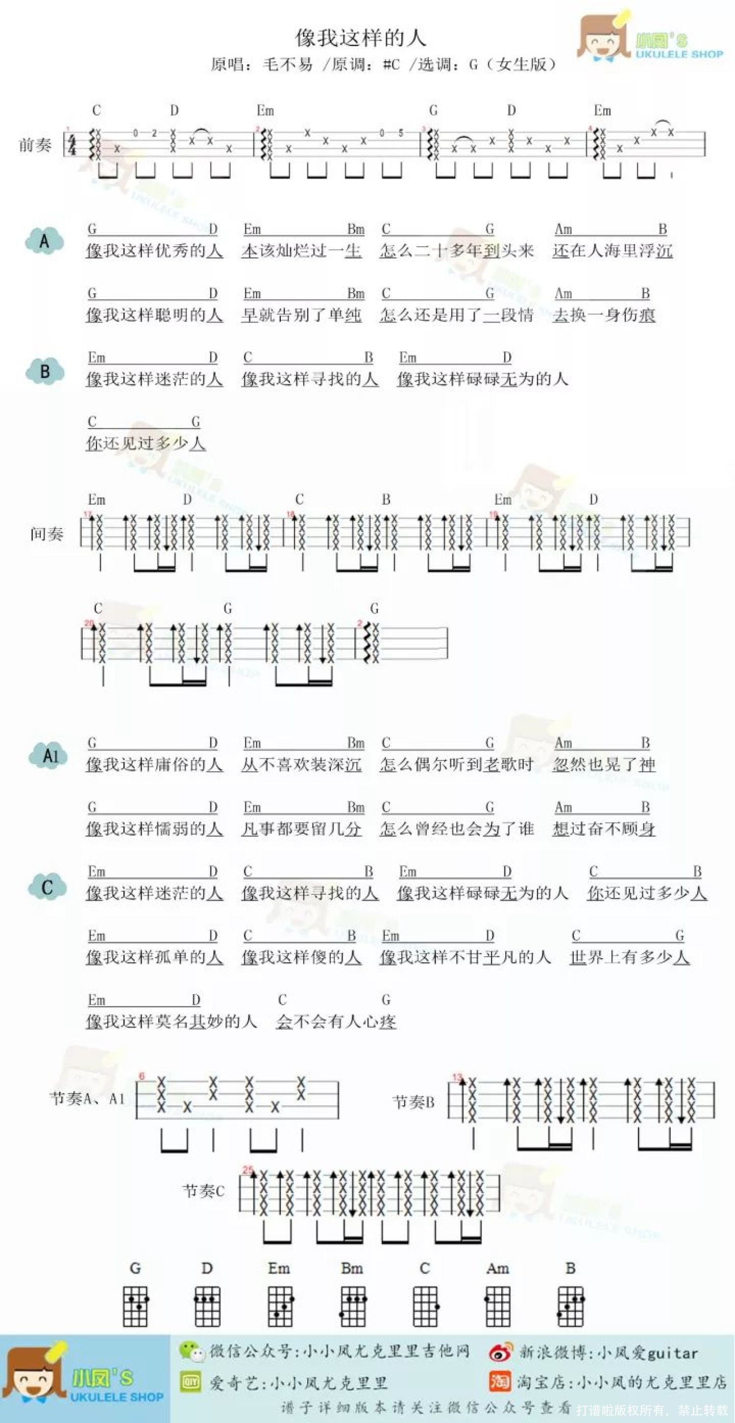 曲谱介绍: 尤克里里教学 像我这样的人 那我这样的人 到底是什么样的人 二十几岁的我们 大多都曾自负不可一世 每个人都以为自己是独一无二 每个人都觉得自己是优秀得在闪闪发光的人 我们都渴望有所作为一番成就灿烂得像金子 我们都认为自己不该是这样子不止是这样子 可到头来 还是活成了大多数人的模样 像我们这么聪明的人 本以为早已看透了感情里所有的套路 却也一不小心就深陷其中付出所有真心 直到伤痕累累你仍不舍得松开自己的手 你觉得可能是自己太差劲配不上TA 其实你只是还没有遇到懂得珍惜你的那一个人 像我们这样的庸俗人 一进入人海就不知道哪个是自己了 我们都以为自己刀枪不入百毒不侵 却在街边听到一首老歌的时候 突然停了脚步晃了神五味陈杂 回忆在心头久久缠绕    曲  谱  和弦谱: 女生版本   男生版本   详谱: 女生版本   男生版本