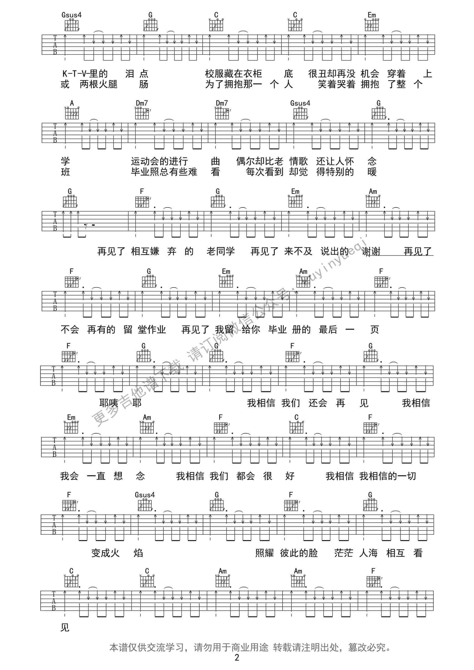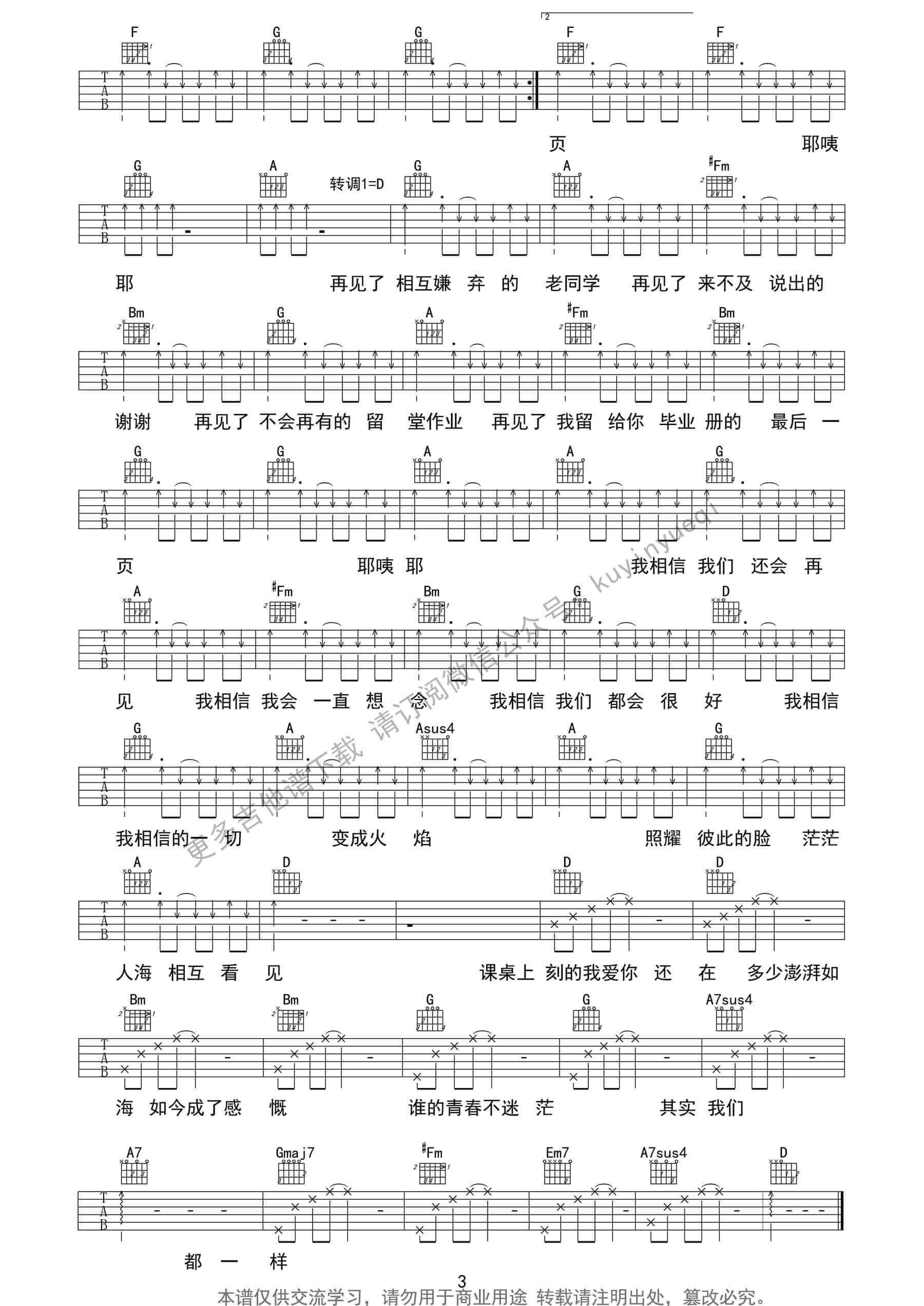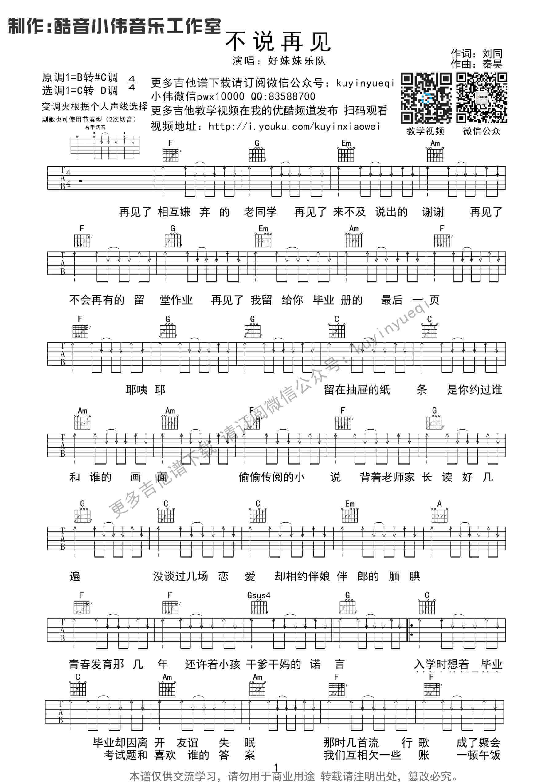 曲谱介绍: 不说再见吉他谱采用了C转D调,由酷音小伟编配完成。这首歌曲虽然是毕业季歌曲,但是却没有那种伤感的旋律,反而是非常的青春,非常有活力,但是仔细聆听这首歌曲的唱词,你会非常的感动,写得非常写实,唱出了很多学生时代的特色。