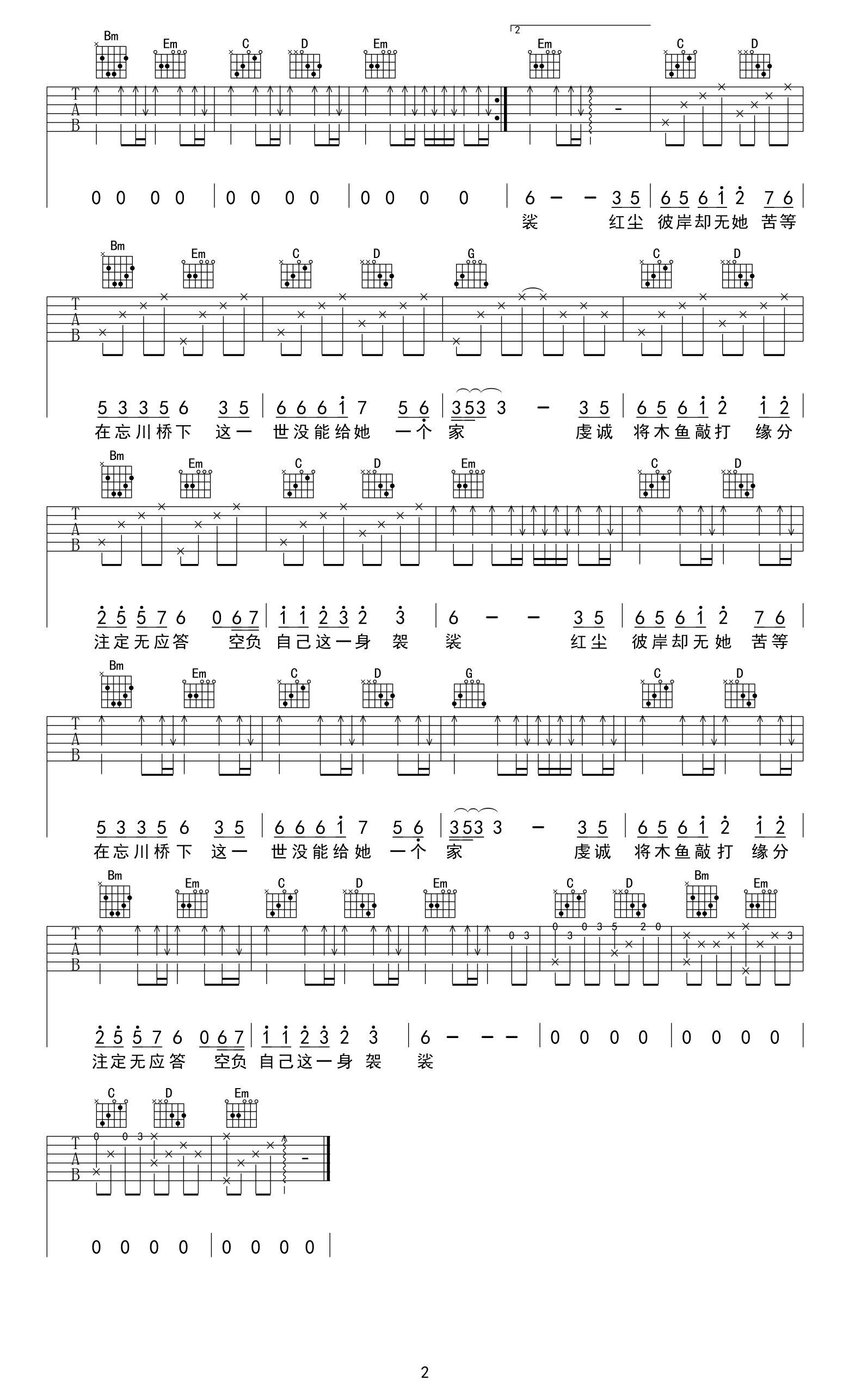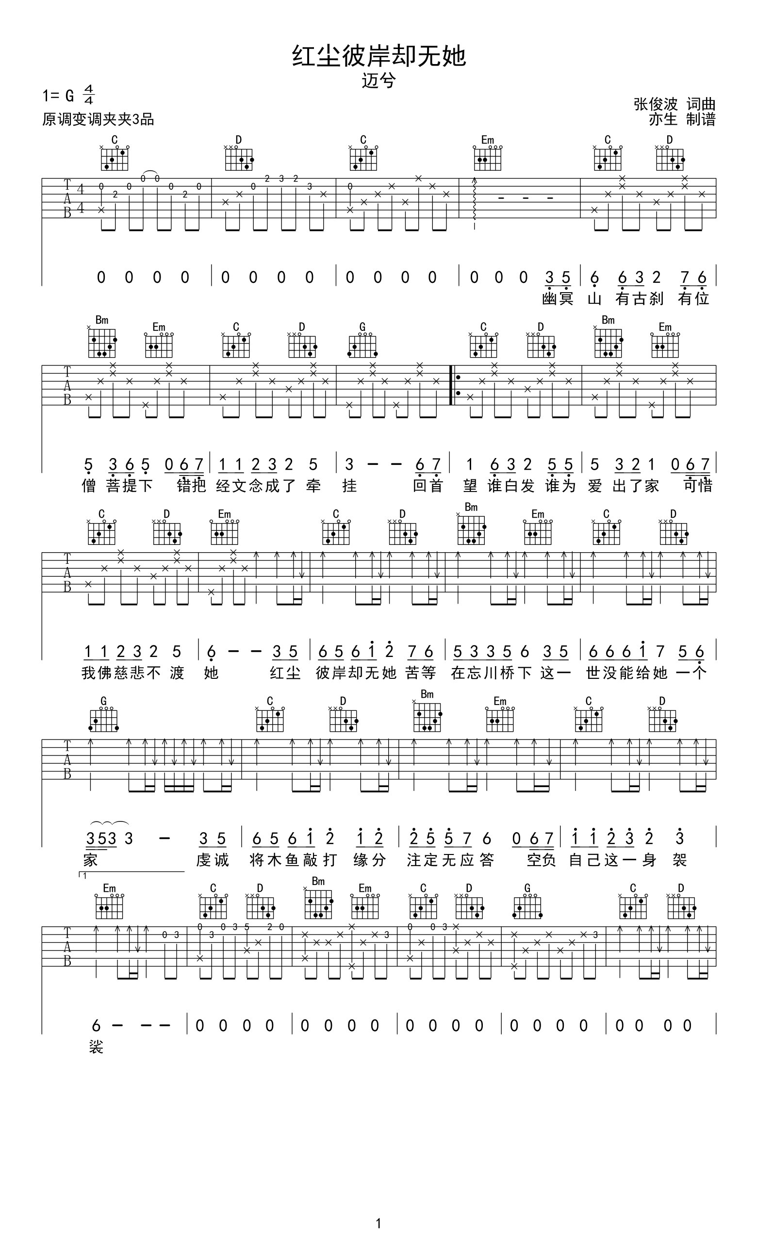曲谱介绍: 红尘彼岸却无她吉他谱,迈兮的一首网络热门歌曲,百世残留只为那片该的对话那一瞬的相拥。《红尘彼岸却无她》吉他弹唱谱,简易版编配,选用C调指法,变调夹夹三品,两张高清图片六线谱、
