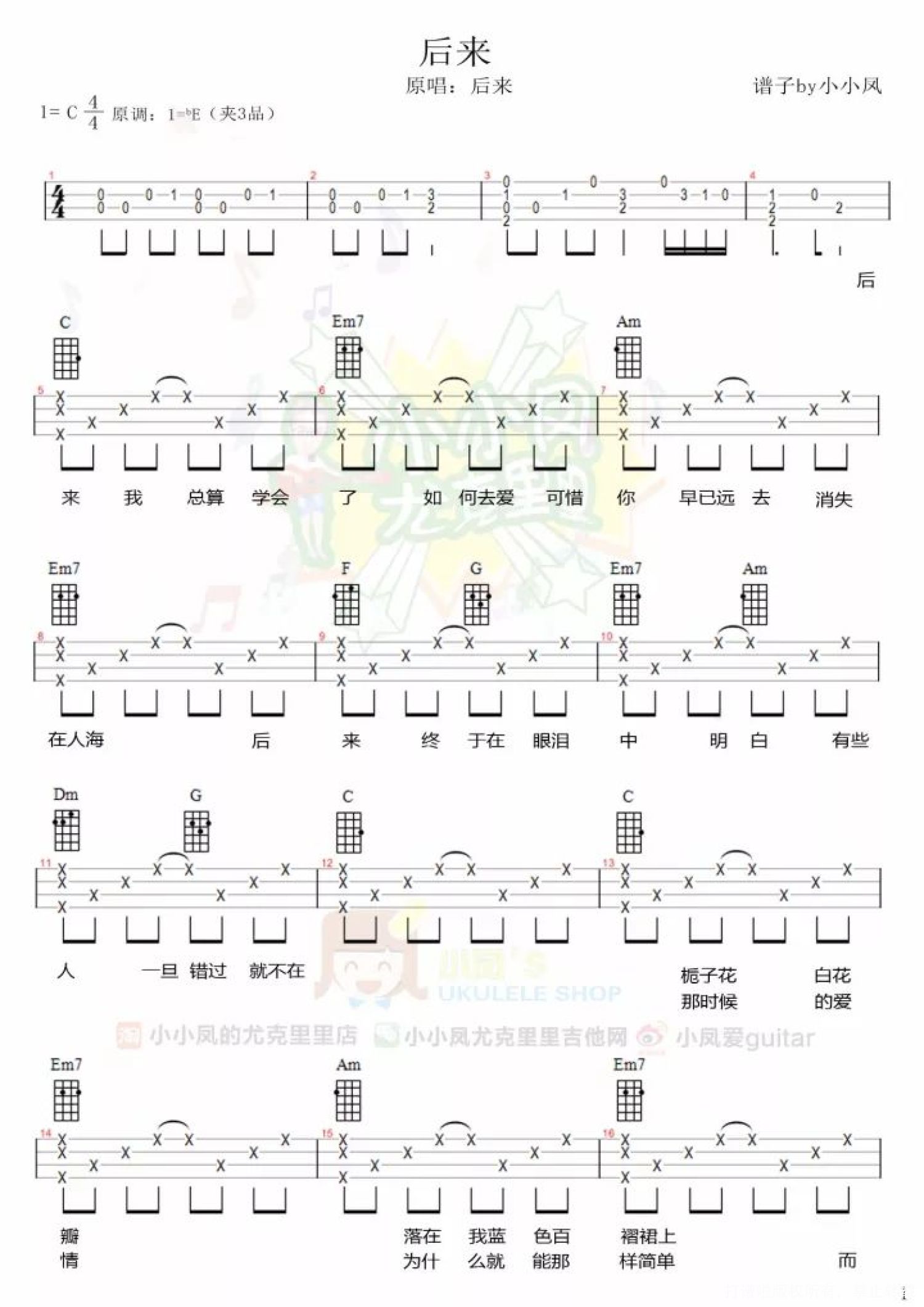 曲谱介绍: 《后来》尤克里里谱   年少时候的爱情总是很简单 会偷偷的给TA买好早餐放在桌子上 会在上课的时候偷偷的瞄TA一眼又赶紧装着很认真听课的样子 会假装不经意的在路上偶遇一起去饭堂吃着那难吃却不得不吃的饭菜 会瞒着所有同学老师在校园散散步约个会 ...... 也正是因为年少轻狂 所以总是任性妄为 所以总是爱得用尽全力奋不顾身 所以总是任意伤害觉得彼此不会离开 后来 很多很多年的后来 你总是想 如果当初我们不那么倔强 如果我们不是总觉得一辈子那么长还有时间什么可以慢慢来 如果我们肯稍微低下头 现在是不是 会不那么遗憾 但是 没有如果 也没有后来