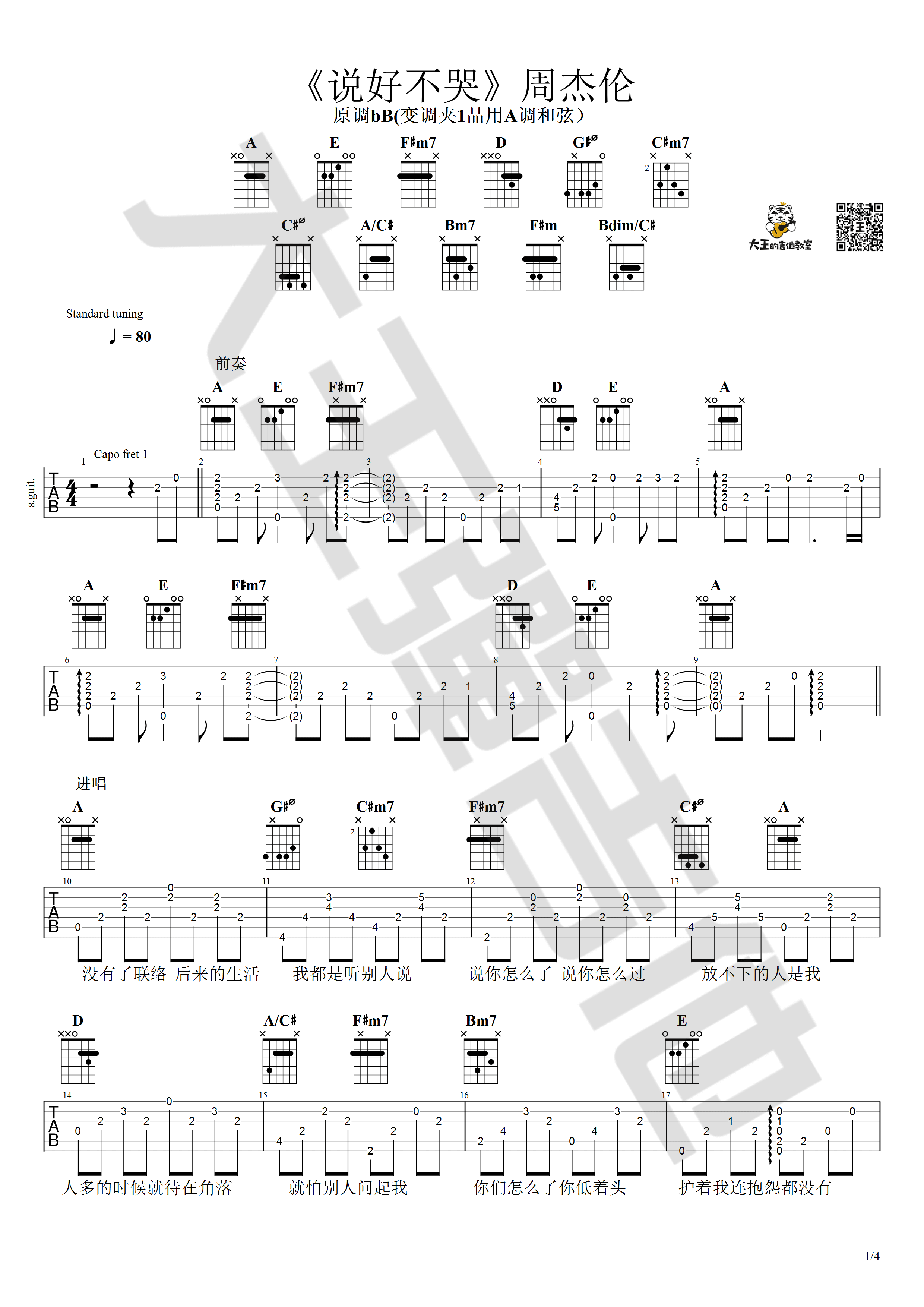 曲谱介绍: 周杰伦新歌《说好不哭》深夜刷屏,QQ音乐因为访问量巨大也造成功能瘫痪。真正是周杰伦的歌曲陪伴整个青春的一群人,也让我们再次领略了怀旧的力量,希望周杰伦可以更努力一点,给嗷嗷待哺的80、90后写出更多的歌,拍更多的MV,记得要拉上方文山,当然像阿信这样的惊喜也不嫌多。 本文分享的是来自大王弹吉他编配的《说好不哭》吉他谱,A调指法版,附上弹唱视频演示。 吉他弹唱演示及视频教学