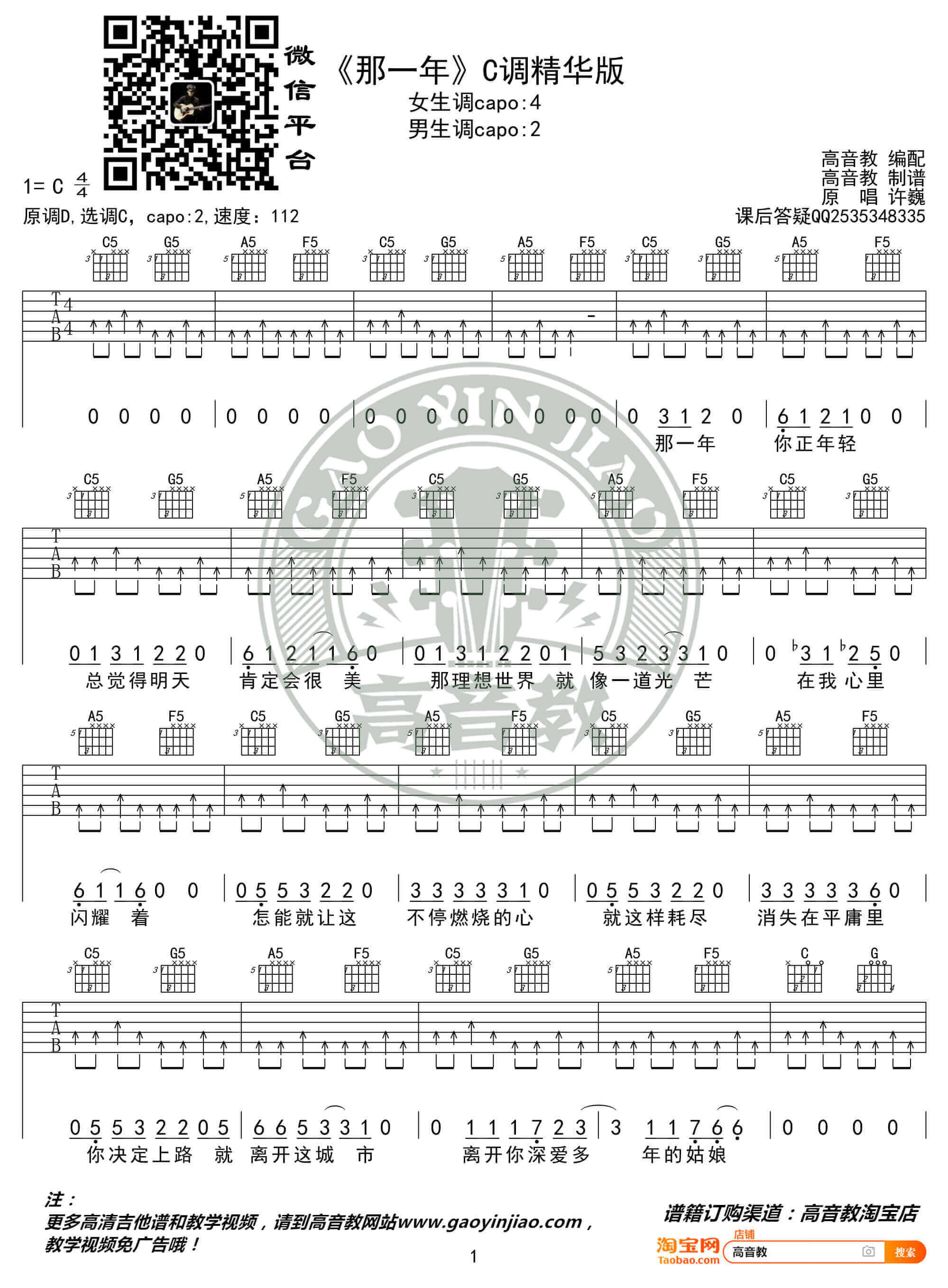 曲谱介绍: 许巍《那一年》吉他谱分享, 高音教编配C调精华版六线谱,原调D调,弹唱变调夹夹第二品。许巍穷困潦倒时的这首歌,却点燃了无数人的希望。