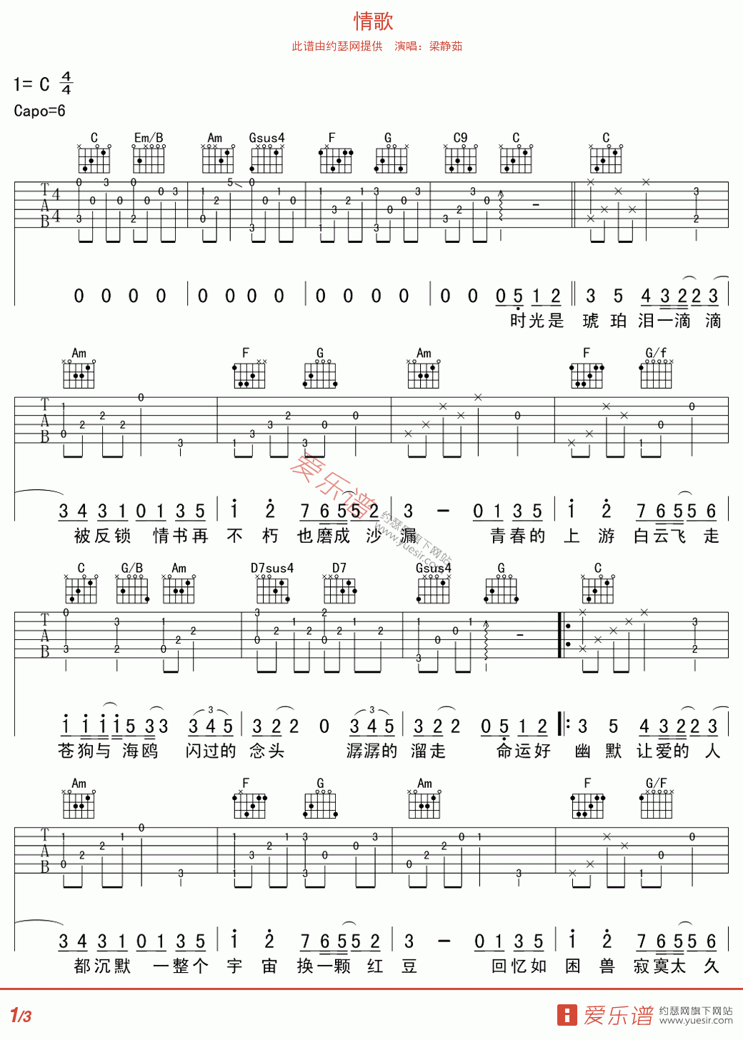曲谱介绍: 梁静茹《情歌》吉他谱,比较适合女生的一首歌。