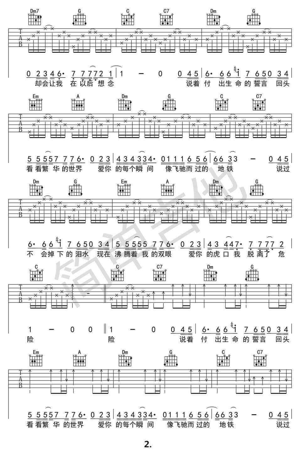 曲谱介绍: 《虎口脱险》老狼03年的作品,老狼在波澜不惊里清冷平静的唱出了青春的心碎遗憾,也唱出了往事如烟后的潇洒转身;张磊的声线和旋律妥帖完美的结合,歌声更加深沉和动情,让人在歌声里不禁细细回味那段青涩的爱情,感伤、怀旧,想起自己年轻时代,感慨时间如白驹过隙。 下面是C调简单版的谱子,CAPO夹五品。