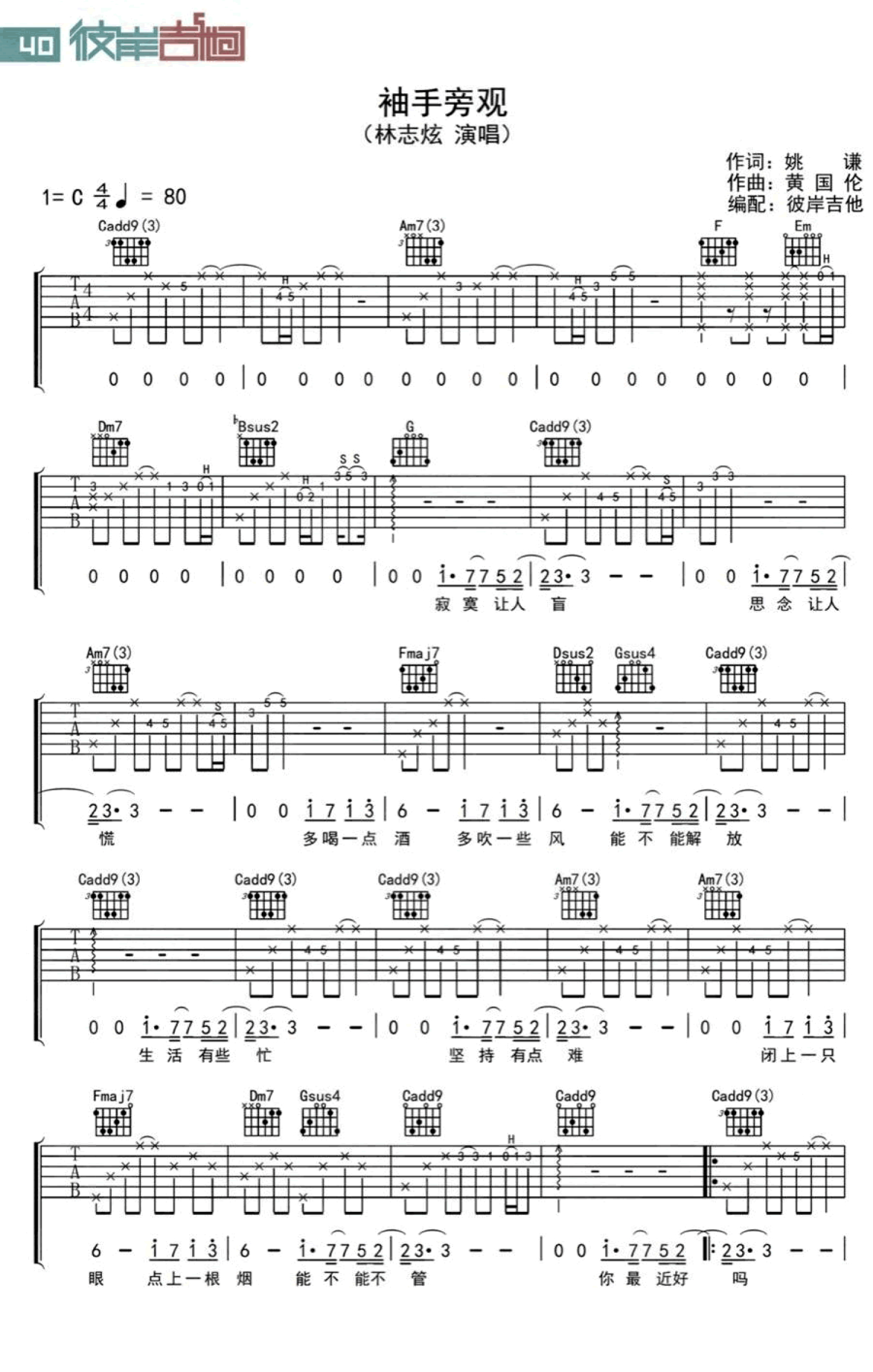 曲谱介绍: 林志炫《袖手旁观》吉他谱,C调弹唱谱,齐秦原唱的一首经典情歌,这首歌曲由李健、张碧晨、张宇和萧敬腾等众多歌手翻唱,给歌曲注入了不同的色彩和情感,本曲谱根据林志炫版本改编。一个人难过的时候听的歌曲,慢慢的节奏愈合你的伤心,旋律里有淡淡的忧伤在心头环绕。