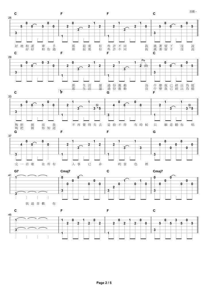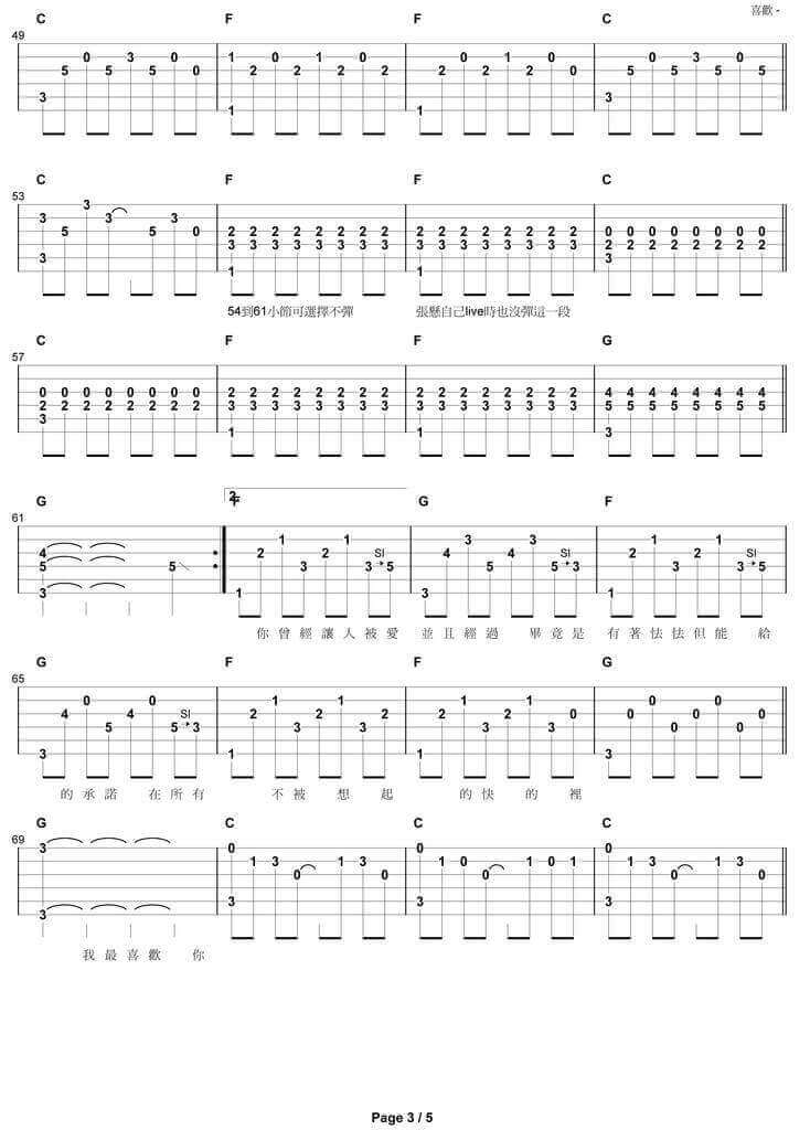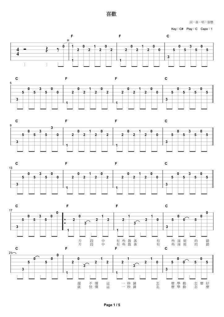 曲谱介绍: 张悬的《喜欢》,先来看一个张悬的现场版演奏视频: 吉他弹唱演示及视频教学 还有下面这个视频,是简化版没有大横按: 吉他弹唱演示及视频教学 下面是吉他谱: