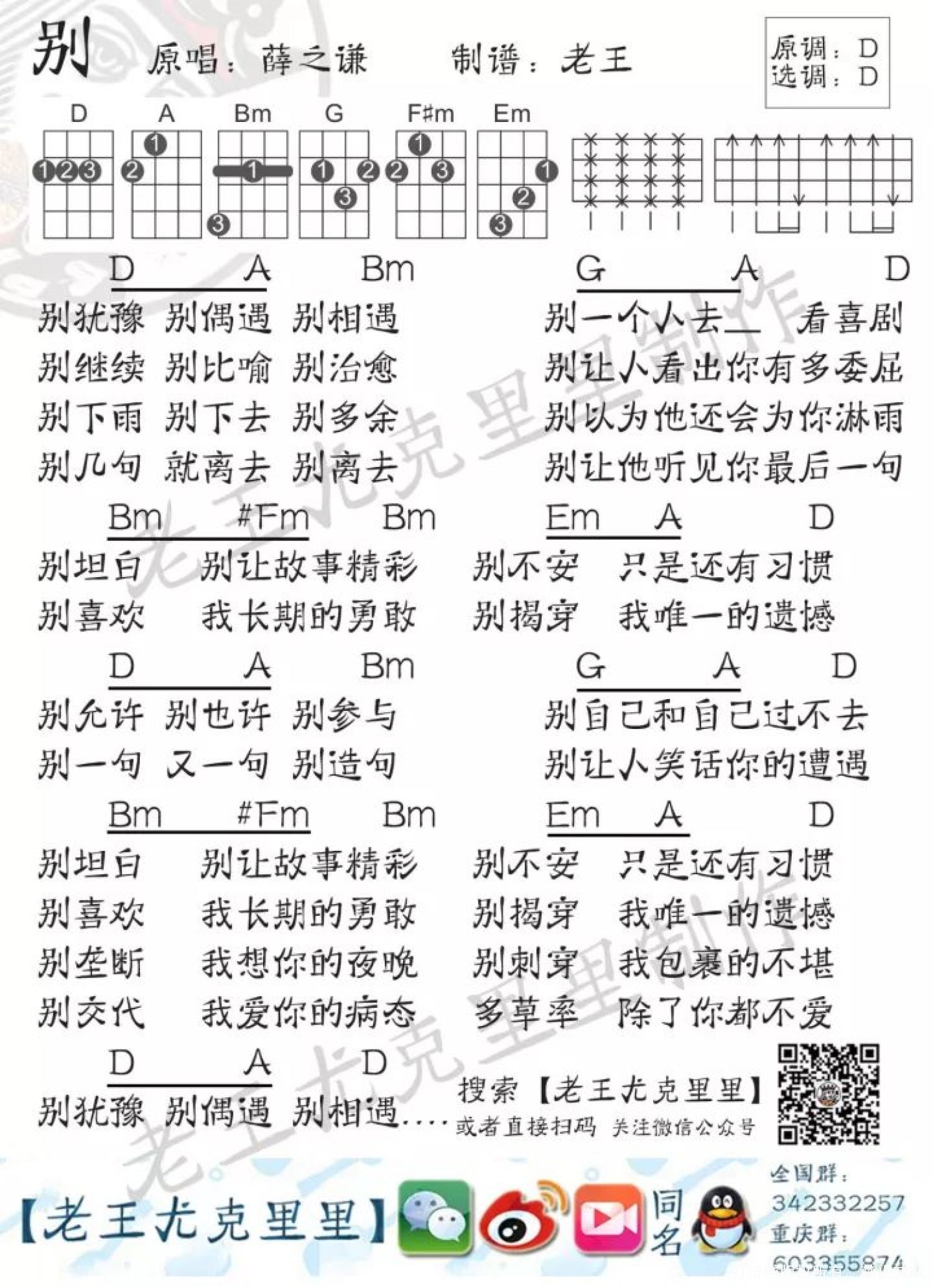 曲谱介绍: 沉寂了一段时间的薛之谦终于现身了,这次带来了新歌: 很简单,但依然是很薛之谦的一首情歌。 老王第一时间把这首歌的谱子扒了出来,节奏型就是最基础的节奏型,和弦虽然是按照原调D调编配的,但是难度并不大,就两组简单的和弦走向,实在觉得和弦困难的同学,可以尝试换成C调和弦进行弹唱。   别 尤克里里谱