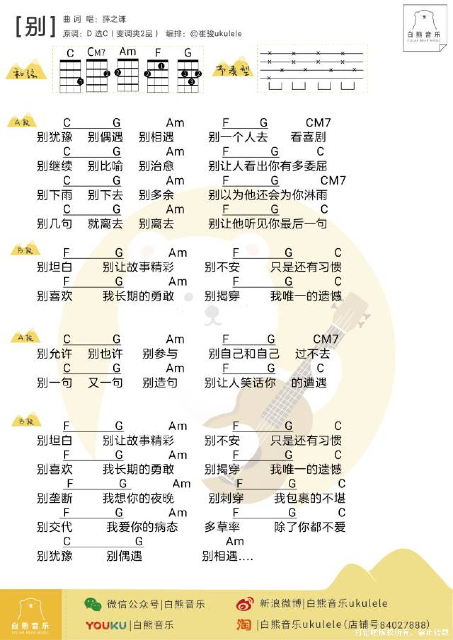 曲谱介绍: "在黑暗里选择不语的他,却缄默着属于自己保持沉默的道理,像是人人都有心事,想表达却又想把它唱起来,最后那些无以言说的情绪被谱成诗,等你来悟;"   尤克里里弹唱教学   别 尤克里里谱