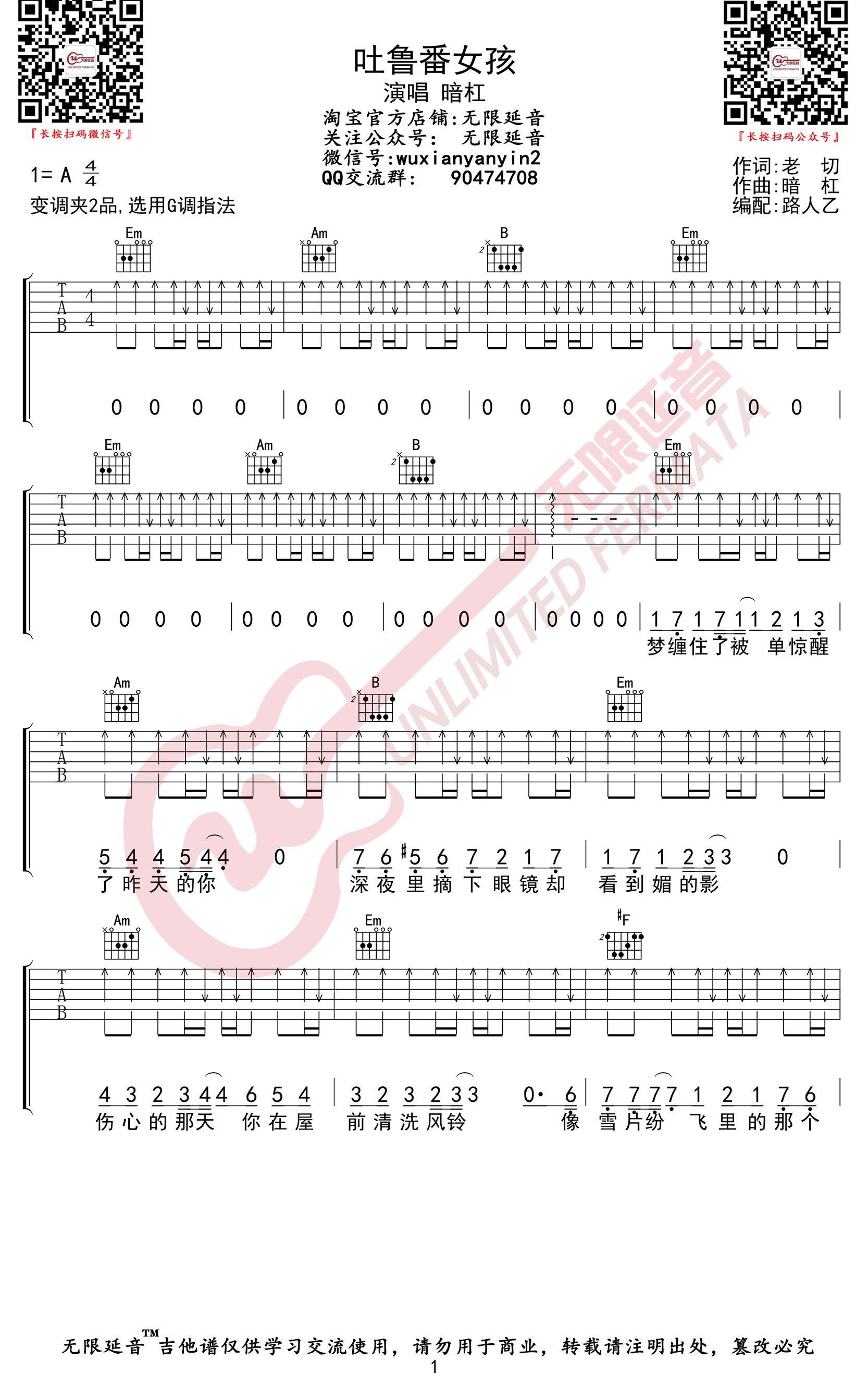 吐鲁番女孩吉他谱 - 暗杠 - A调吉他弹唱谱