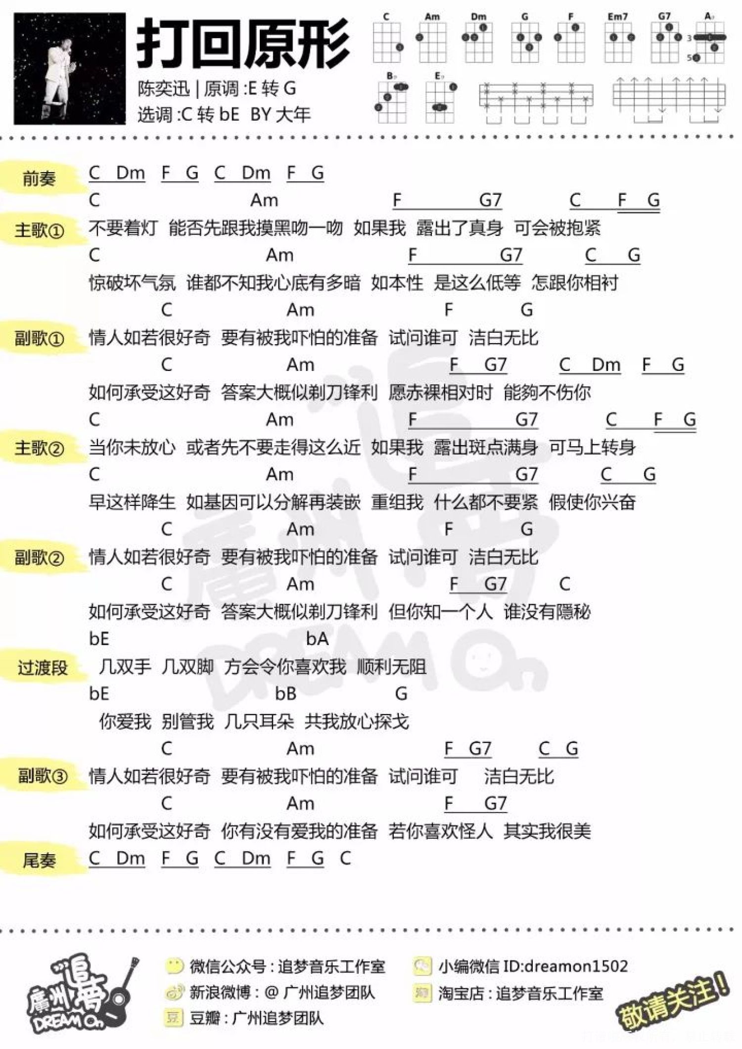 曲谱介绍: 万圣节如期而至 但是小编还要加班写推文 有没有小姐姐小哥哥心疼3秒钟 (没有) 好的,小编有自言自语了 万圣节到来,出门都能看到很多酷酷的脸 真的羡慕! 好啦 今天给大家推送陈奕迅的歌曲 《打回原形》   《打回原形》 尤克里里谱