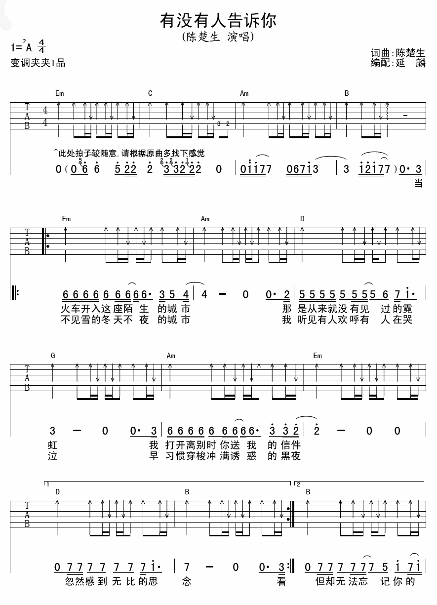 曲谱介绍: 有没有人告诉你吉他谱采用了bA调指法,由延麟编配完成。这一首歌曲一度受到了很多人的支持和喜爱,被广为传唱,陈楚生的音乐作品总是很有深度,让很多人喜爱不已,陈楚生也是凭借这首歌火遍大江南北,在这首歌曲之中,里面的无奈,里面的不甘,让每一个人都心有感触,尤其是对那些生活不是一帆风顺的人而言,触动更大,在这个世界上,每一个人都不可能随心所欲,很多时候更多的是无奈。
