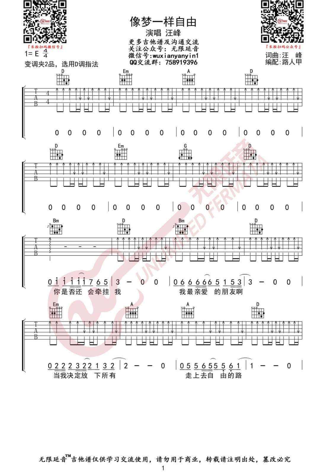 像梦一样自由吉他谱 - 汪峰 - D调吉他弹唱谱