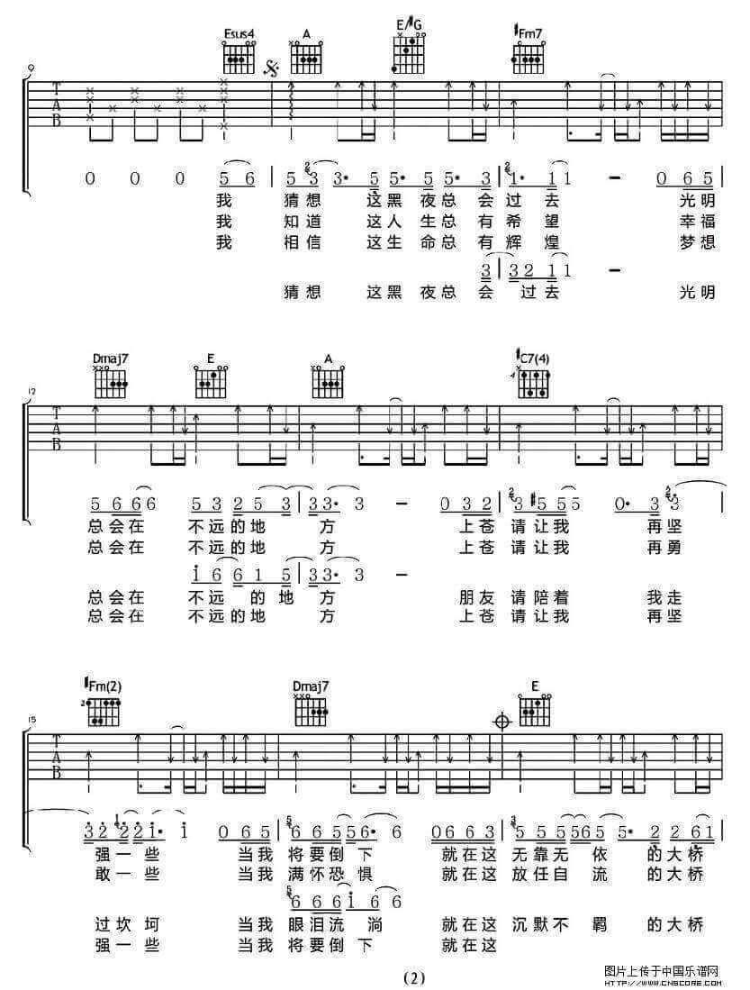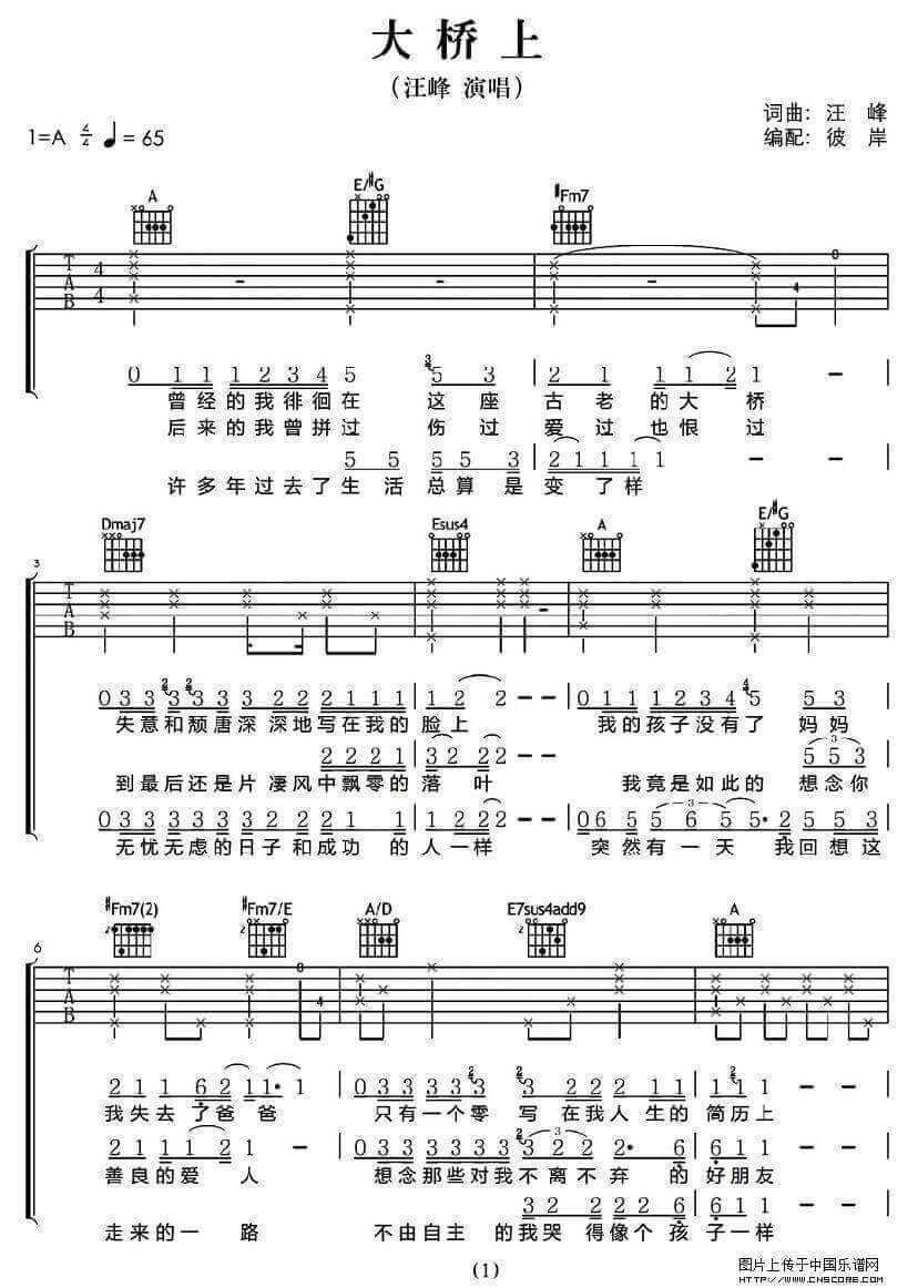 曲谱介绍: 大桥上吉他谱采用了A调指法,由彼岸吉他编配完成。