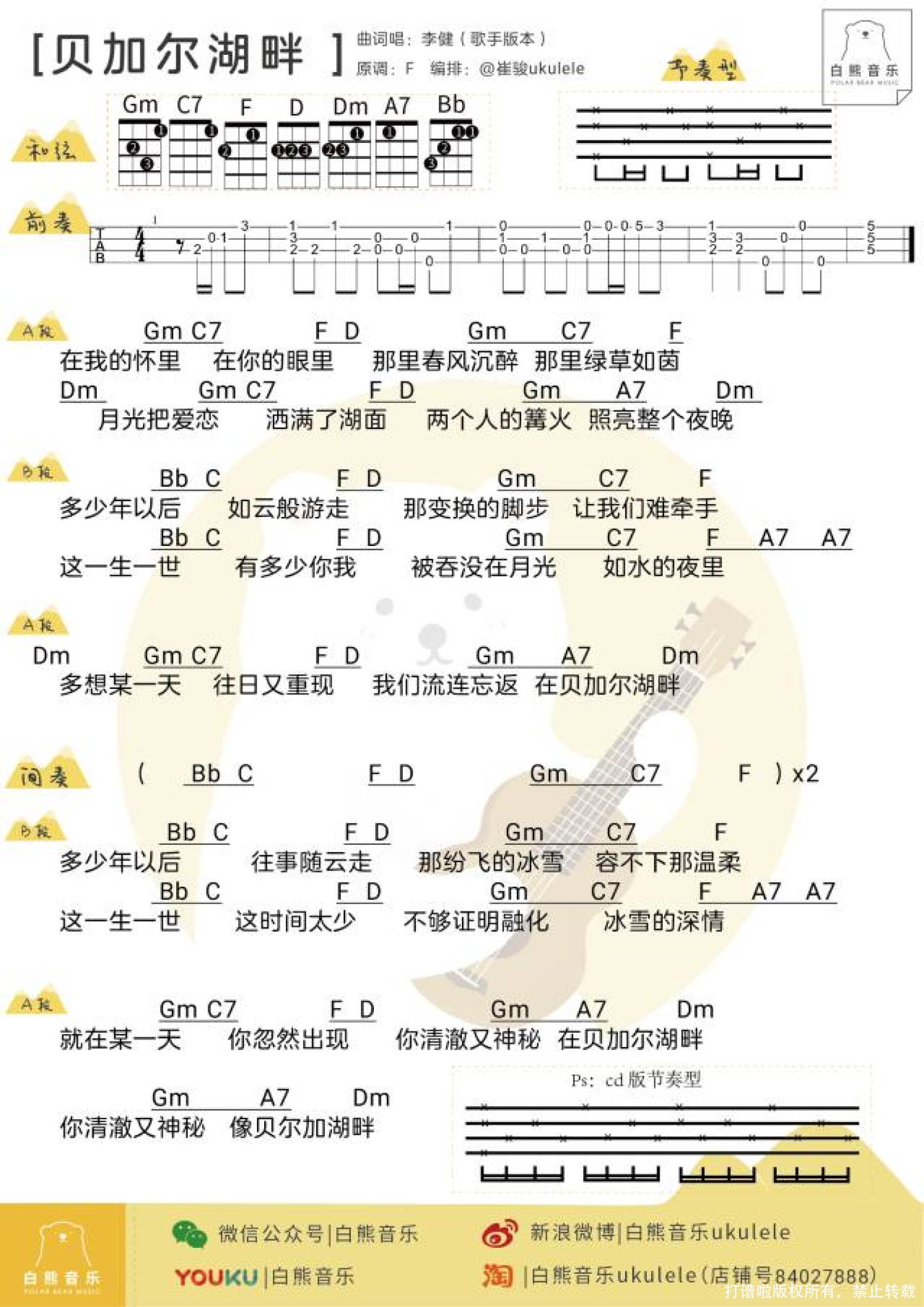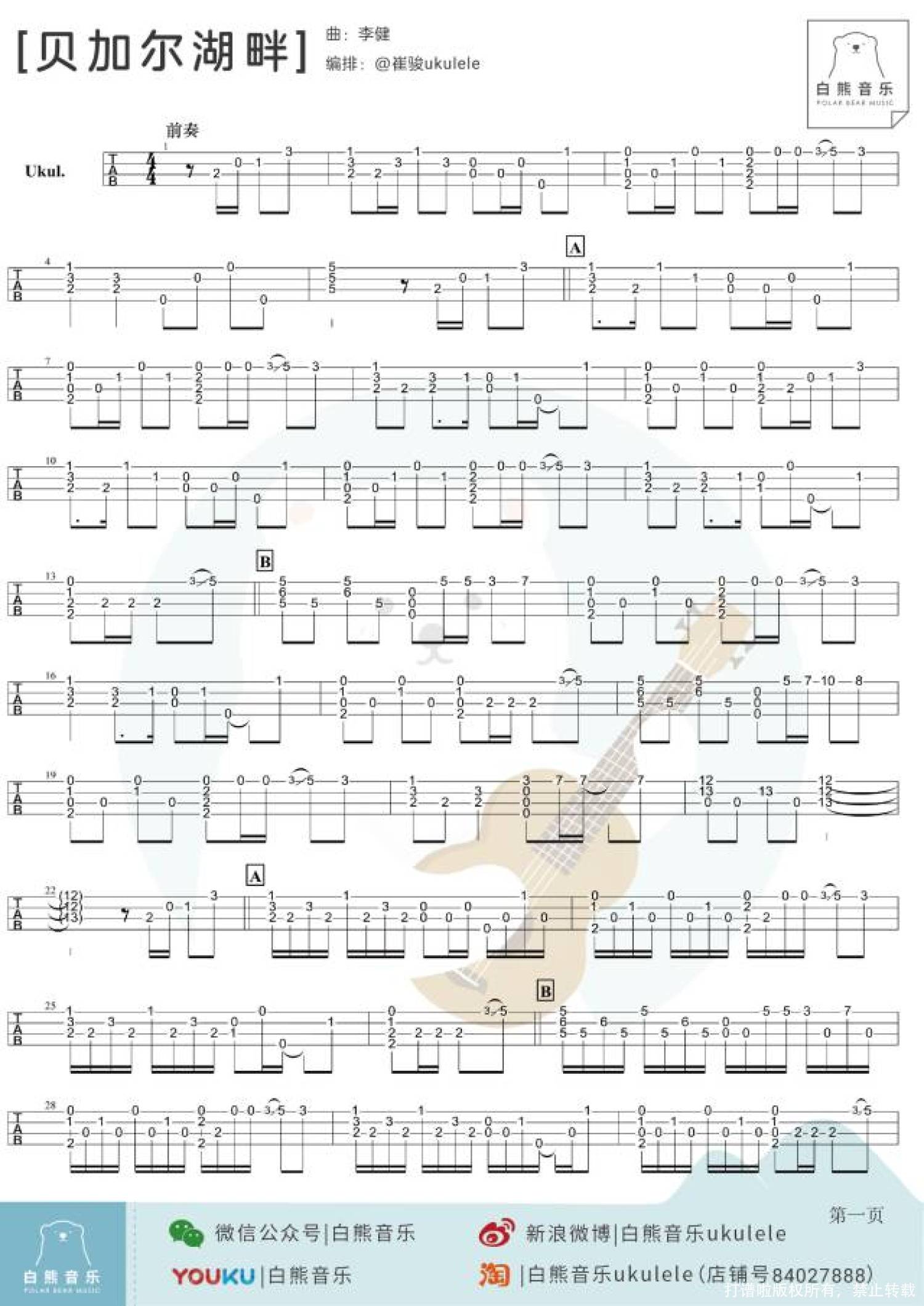 曲谱介绍: "这一生一世 这时间太少 不够证明融化冰雪的深情" {一首空灵悠扬的歌曲,俄罗斯风格的民谣曲风,加上李健温暖的声音,将聆听者带入贝加尔湖畔的美景,仿佛置身于其中的浪漫故事}   Ukulele 指弹独奏   ◎〈贝加尔湖畔〉是李健演唱作词作曲的一首歌曲,收录于李健2011年12月10日发行的专辑「依然」。2014年,周深和李维凭借该曲获得中国好声音年度金曲奖; {最诗意的纪录方式 最动人的人文关切 最深情的醉心吟唱 可以追随一生的温暖与澄澈}   指弹教学   弹唱教学   尤 克 里 里 谱 指弹谱   弹唱谱