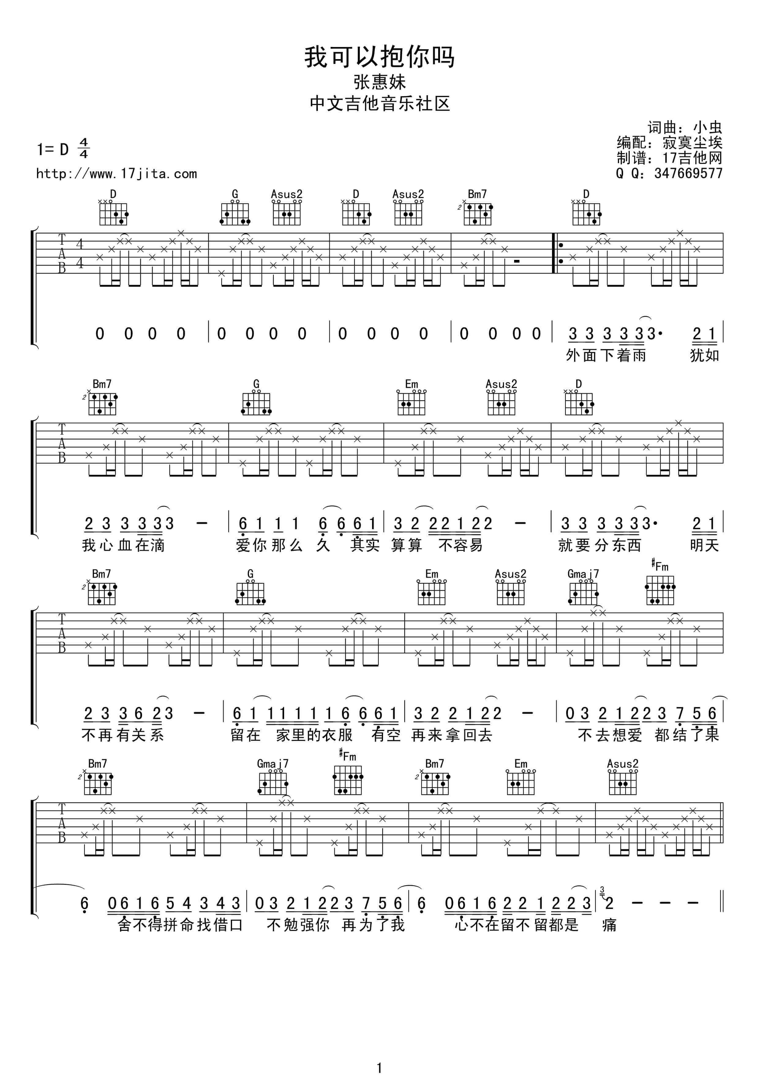曲谱介绍: 我可以抱你吗吉他谱采用了D调指法,由寂寞尘埃编配完成。这首是张惠妹的歌,那时她有好多很好听的音乐,这首歌,用了非常温柔的流行歌曲的普遍唱法,我可以拥抱你吗?我的爱人,拥抱是非常美好的词语,它莫名其妙给人一种安全感。