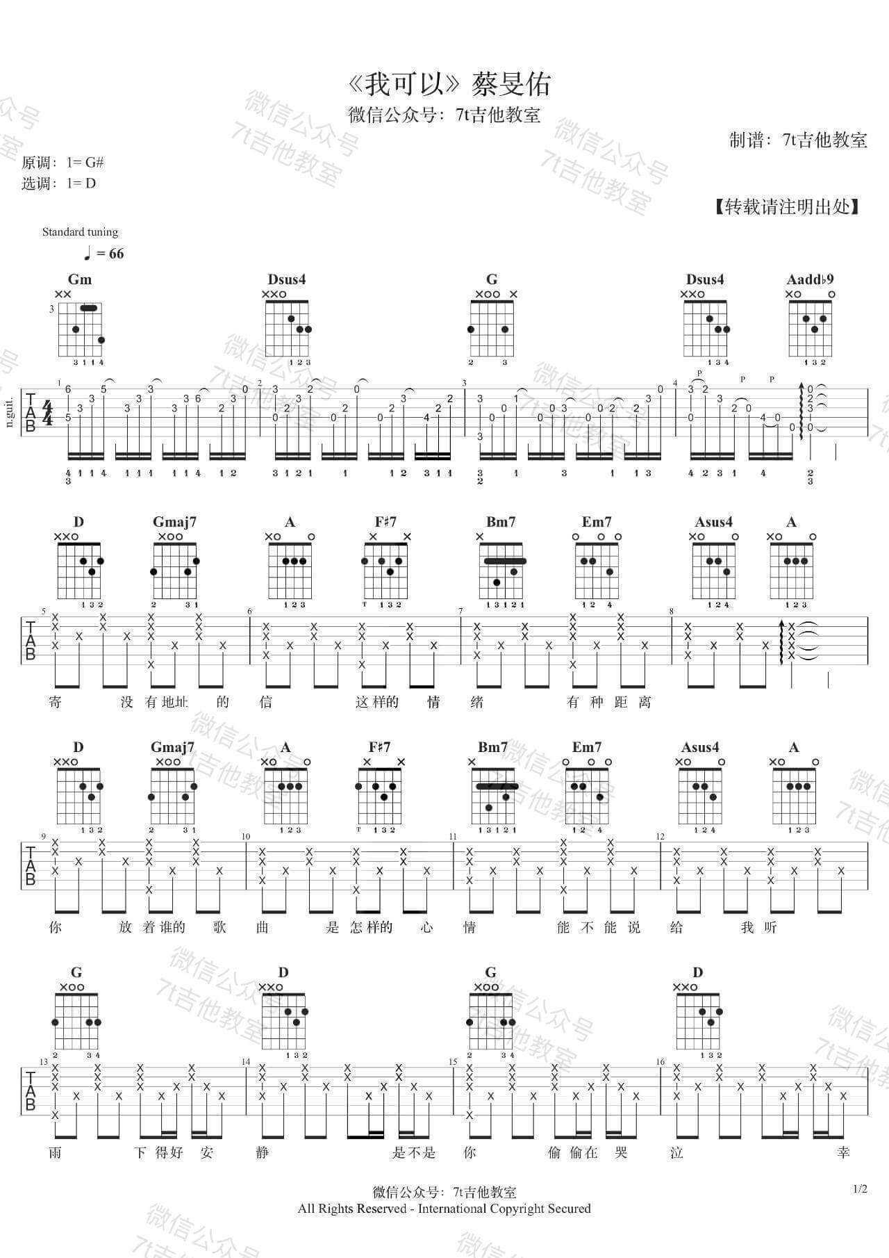 曲谱介绍: 我可以吉他谱采用了D调指法,由7t吉他教室编配完成。 吉他弹唱演示及视频教学