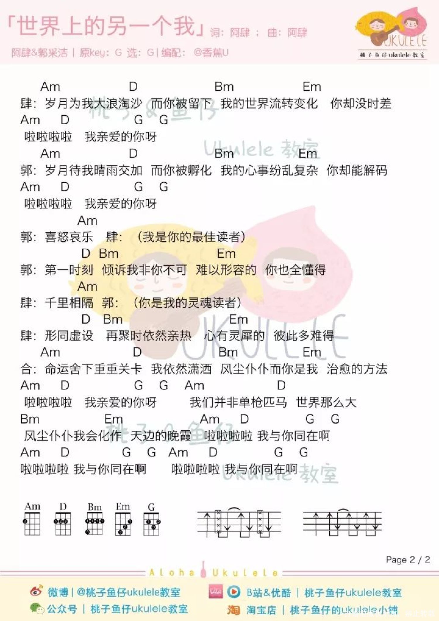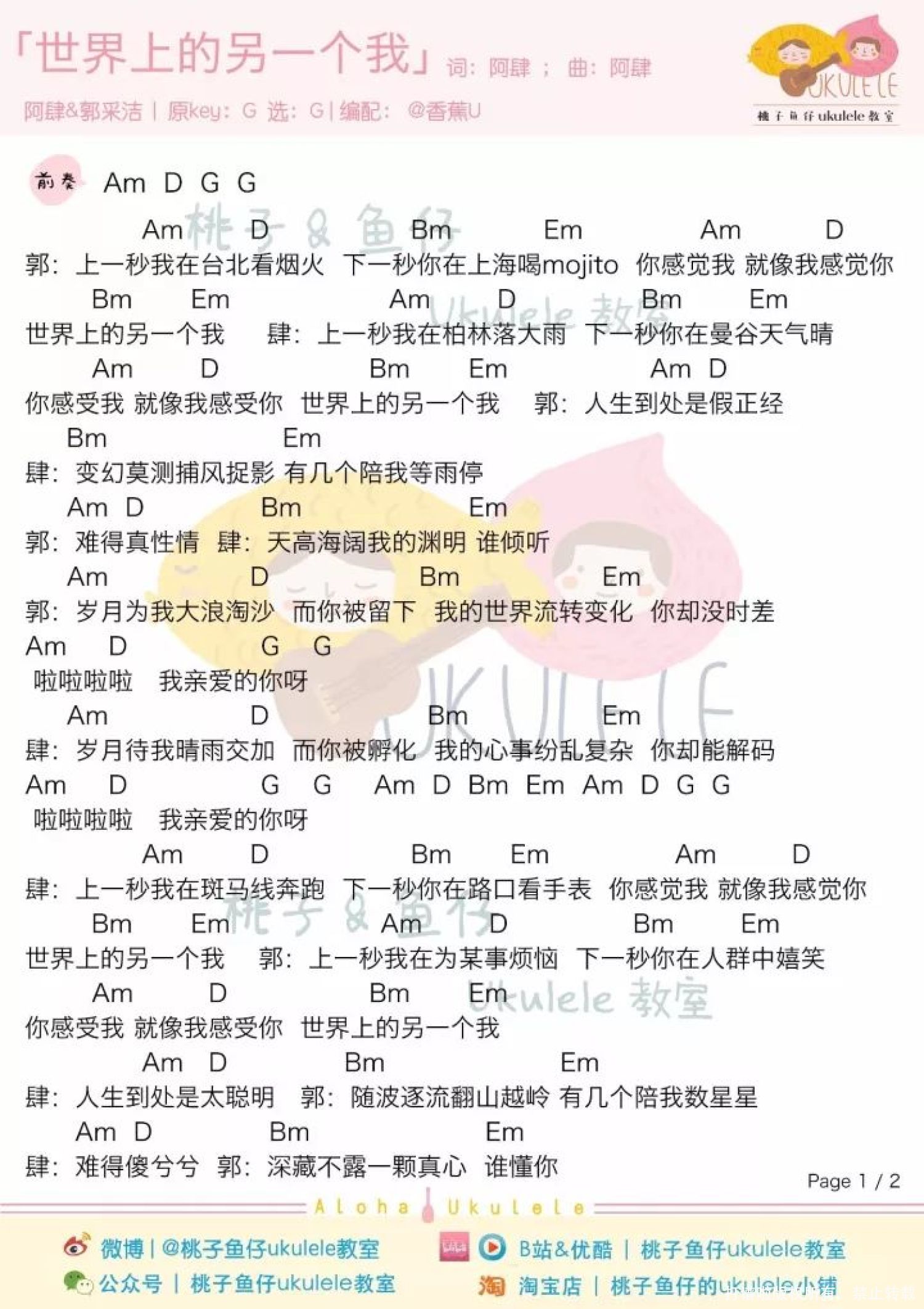 曲谱介绍: ▌《世界上的另一个我》是由阿肆作词、作曲,阿肆、郭采洁演唱的一首歌曲,发行于2017年10月24日。 ● 当“解忧少女“阿肆联袂超人气女神郭采洁——Boom!最风和日丽的暖意,最“刚好”的少女友谊,全新单曲《世界上的另一个我》今日甜蜜发射,献给“最亲爱的你”。 如果文字也可以通过味觉感知,那“闺蜜”的口感一定是软软甜甜的,放进嘴里就迫不及待地化掉,与你融为一体。即使相隔千里,也随时随地游荡在身体里;疲倦的深夜,在耳边演奏安眠曲;受伤彷徨时,变身治愈的蔚蓝色小药片;开心的日子里,在心脏上跳可爱的舞。闺蜜就是想到,即是安心。     尤克里里吉他弹唱cover Cover By Banana & Isabella 愿你知道 世界那么大 我们并非单枪匹马 尤克里里弹唱教学   尤克里里谱