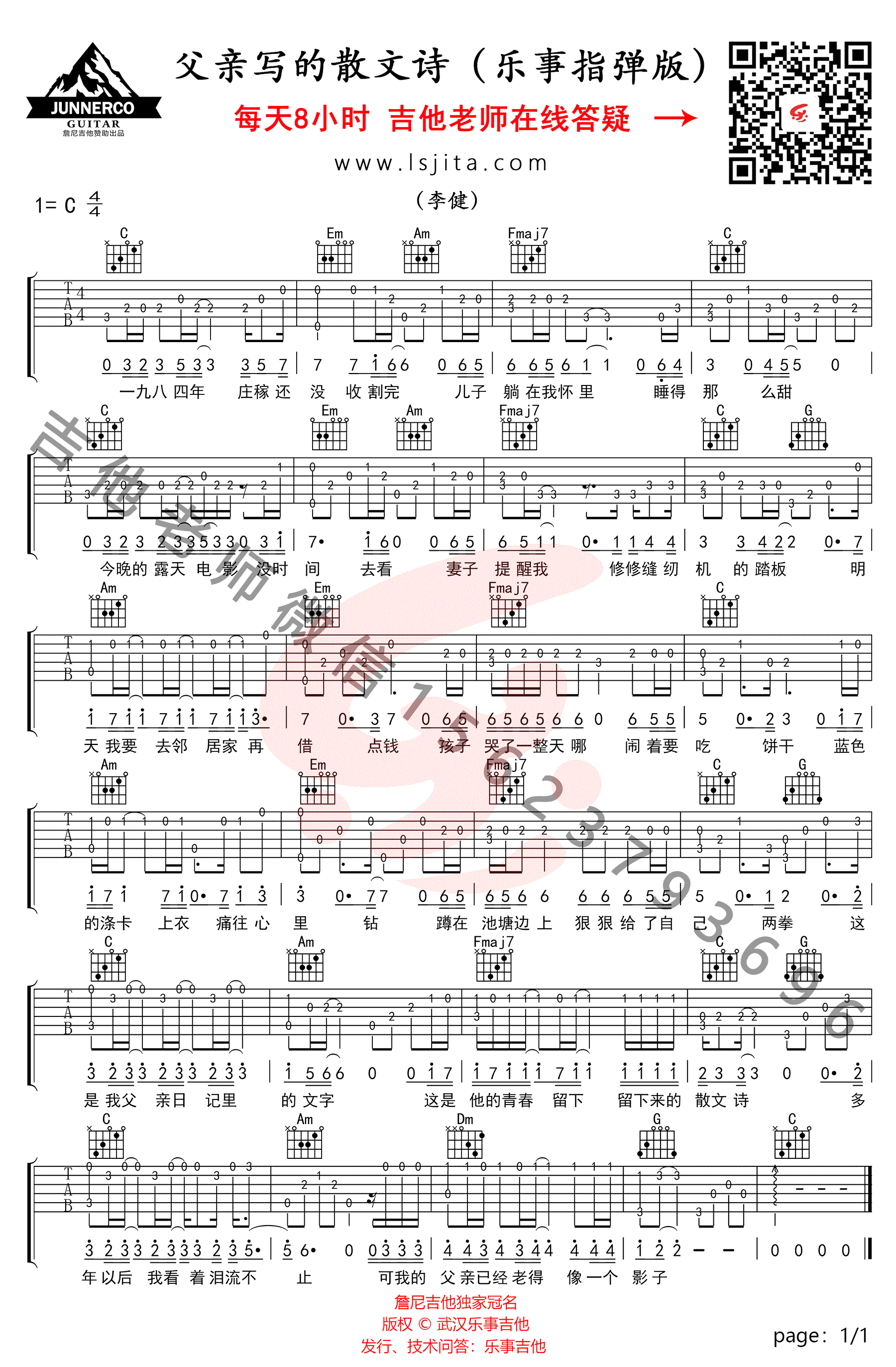 曲谱介绍: 父亲写的散文诗指弹谱,许飞原创歌曲改编,父亲写的散文诗吉他独奏谱,C调指法,高清图片谱。随谱附上配套指弹吉他教学视频,感谢乐事吉他编配制谱。 李健在《我是歌手》的翻唱演绎,也让这首关于父爱的歌曲,感动更多的听众。本曲谱也非常适合新手练习,琴友们跟随老师的示范讲解学习起来吧。 吉他弹唱演示及视频教学