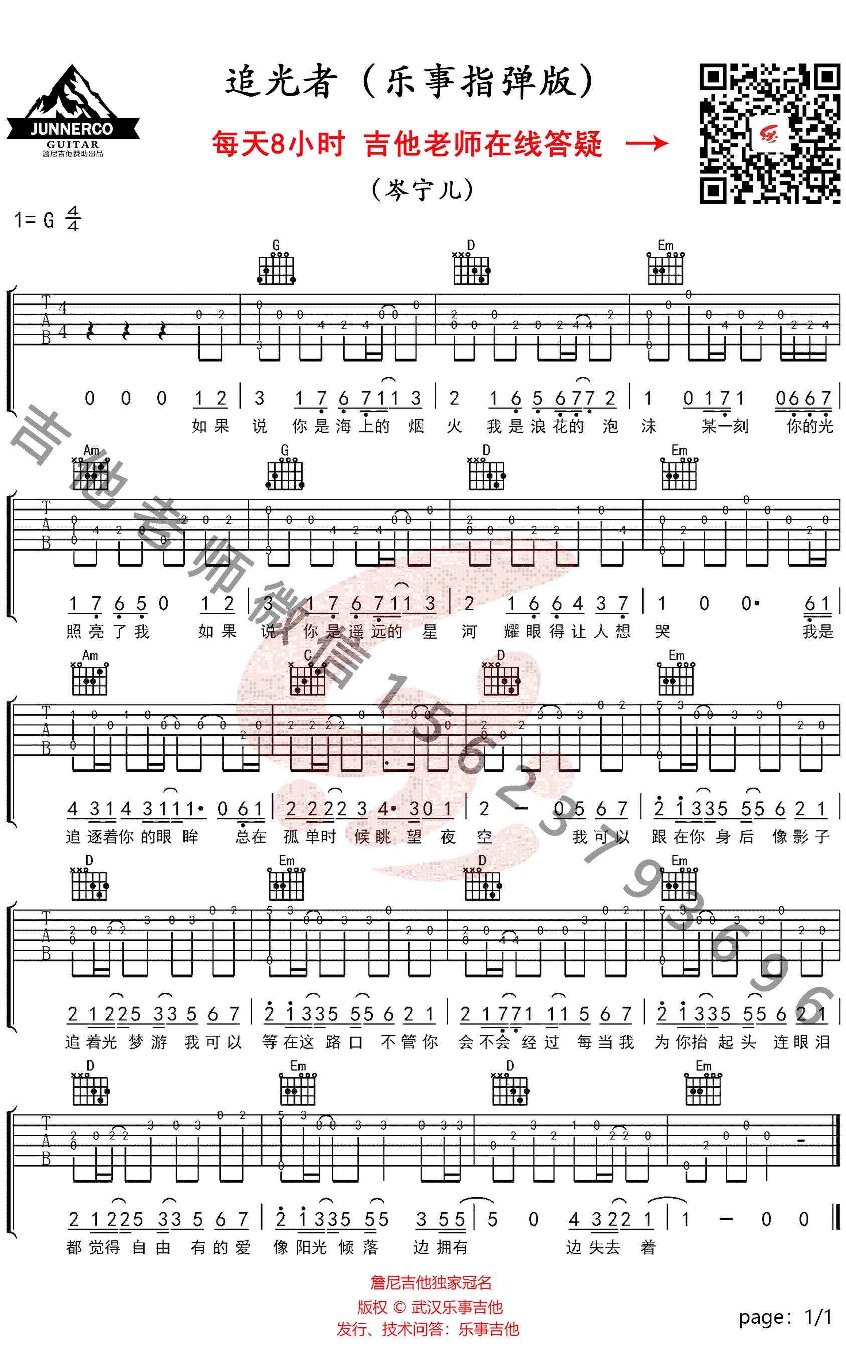 曲谱介绍: 追光者指弹谱,岑宁儿演唱的热门电视剧《夏至未至》中的插曲,追光者吉他独奏谱,高清图片谱,乐事吉他编配出品,随谱附上《追光者》指弹演奏和教学视频,同学们参照演示和讲解练习。 17年的夏天,网剧《夏至未至》留下了一段灿烂而温暖的回忆。 「追光者」干净清新的旋律,至今依然让人回忆起夏天的味道。 吉他弹唱演示及视频教学