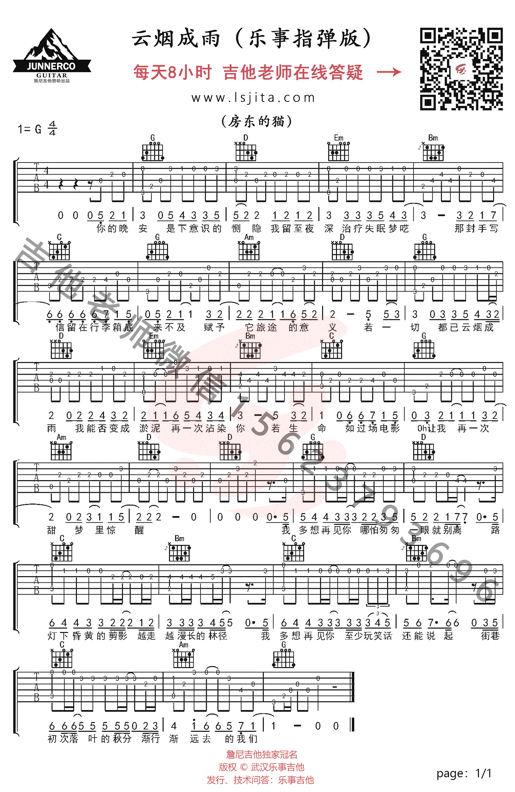 曲谱介绍: 云烟成雨吉他谱指弹版,房东的猫一首经典民谣歌曲改编,也是国产动画片《我是江小白》的片尾曲。云烟成雨吉他独奏谱,高清图片谱,乐事吉他编配出品,吉他源更新分享。随谱附上《云烟成雨》指弹吉他教学视频,同学们参照示范讲解认真练习。 温柔的旋律,淡淡的伤感,讲述一个离别和重逢的故事。 吉他弹唱演示及视频教学
