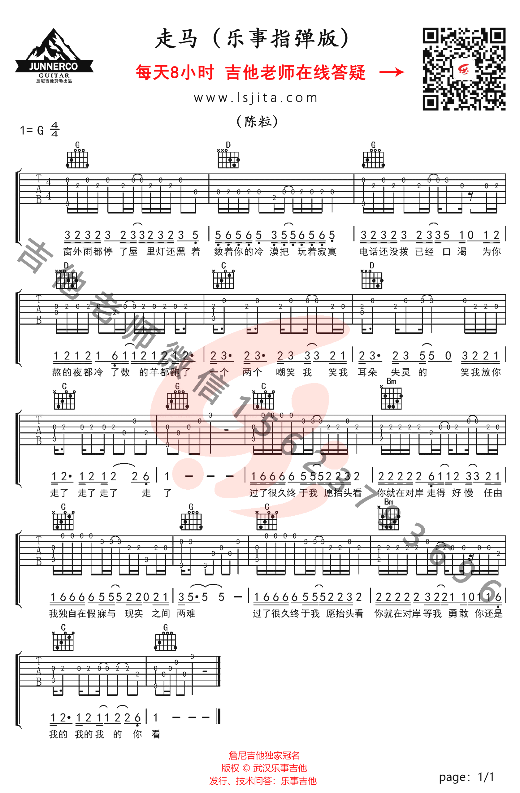 曲谱介绍: 《走马》指弹吉他谱,陈粒演唱的一首民谣创作歌曲改编,走马吉他独奏谱,G调和弦高清图片谱,乐事吉他编配,随谱带来配套教学视频,吉他源整理分享。 吉他弹唱演示及视频教学