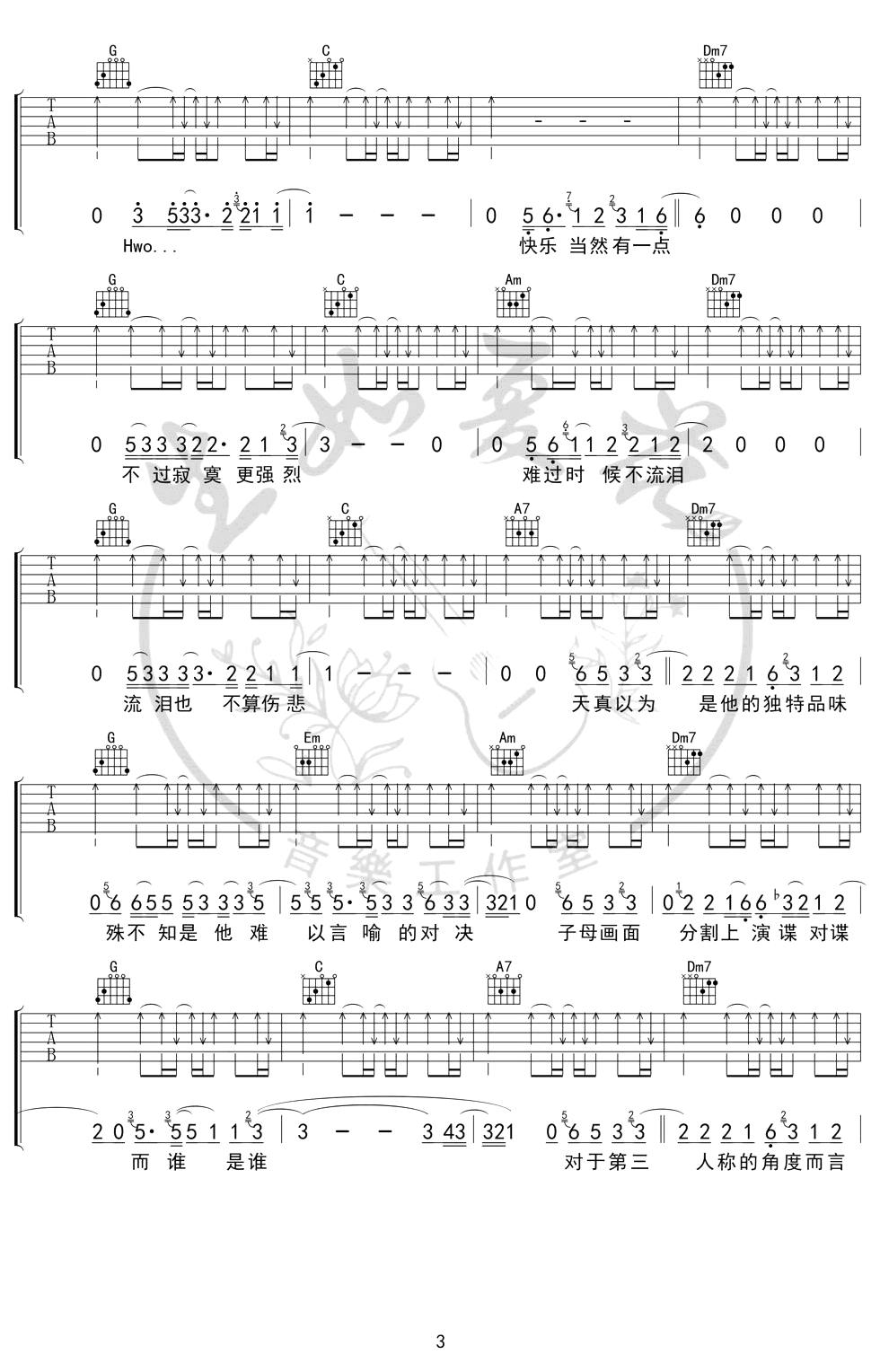 曲谱介绍: 《第三人称》吉他谱,HUSH的一首歌曲,第三人称吉他弹唱六线谱,原调B,选用C调指法,降半音调弦。感谢老杨小宁编配制谱,吉他源更新分享。