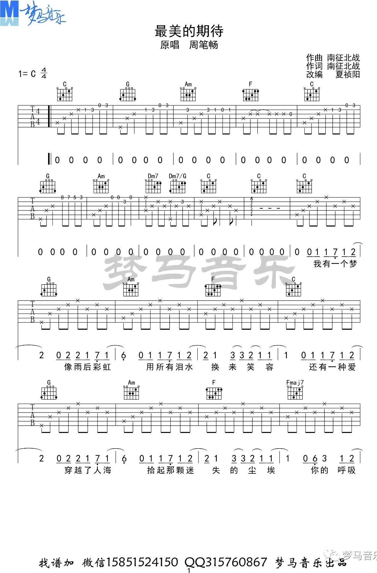 曲谱介绍: 《最美的期待》吉他谱,南征北战词曲创作,周笔畅演唱的一首充满正能量的热门励志歌曲,最美的期待六线谱,C调指法编配,三张弹唱图片谱。梦马音乐编制谱出品,吉他源上传分享。 夏祯阳老师编配说明:本期发布的谱子是《最美的期待》。想改编很久了,只是一直没有找到感觉。之前听的都是周笔畅的版本。直到最近看《武庚纪》,才听到了南征北战的版本。我个人更喜欢南征北战的这个版本。所以我改编了这个不一样的《最美的期待》,希望大家喜欢!