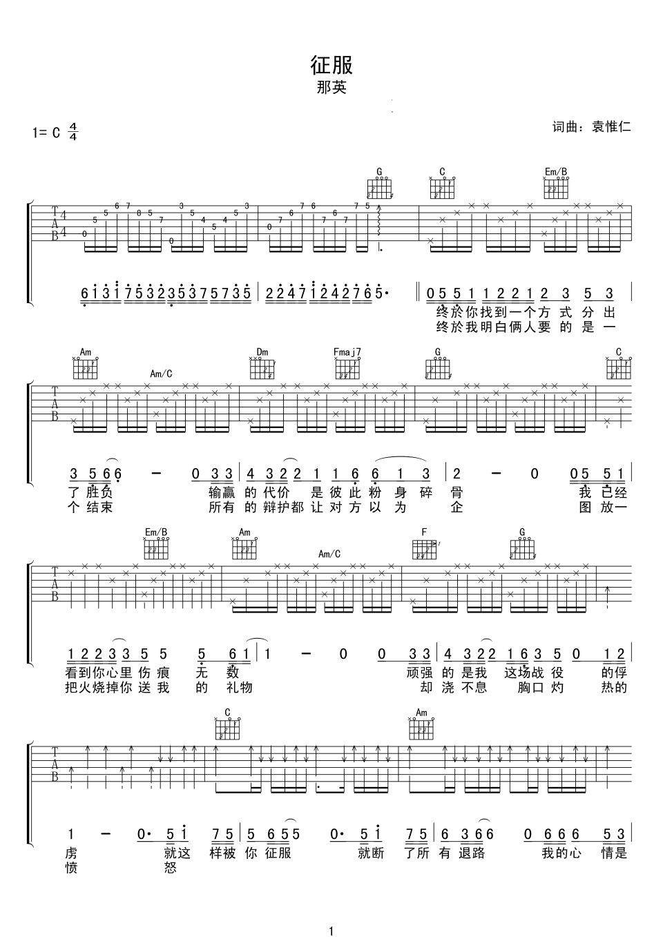 曲谱介绍: 征服吉他谱,那英的一首经典情歌,征服六线谱,C调六线谱编配,本曲谱为高清图片谱例,吉他源上传更新,喜欢这首歌曲的琴友们可以把曲谱另存为下载打印收藏。