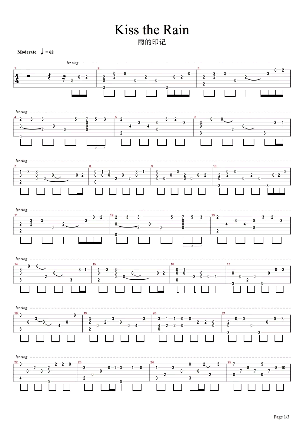 曲谱介绍: Kiss The Rain吉他谱指弹版,李闰珉(yiruma)的一首经典钢琴曲改编,优美而略显伤感,温暖而柔情四溢。Kiss The Rain 雨的印记指弹吉他独奏谱,三张图片谱,感谢编配,吉他源上传收藏。 韩国钢琴演奏家李闰珉的音乐作品,将东方的抒情与西方的典雅合二为一,完美呈现出纯净与清新的个人特色。