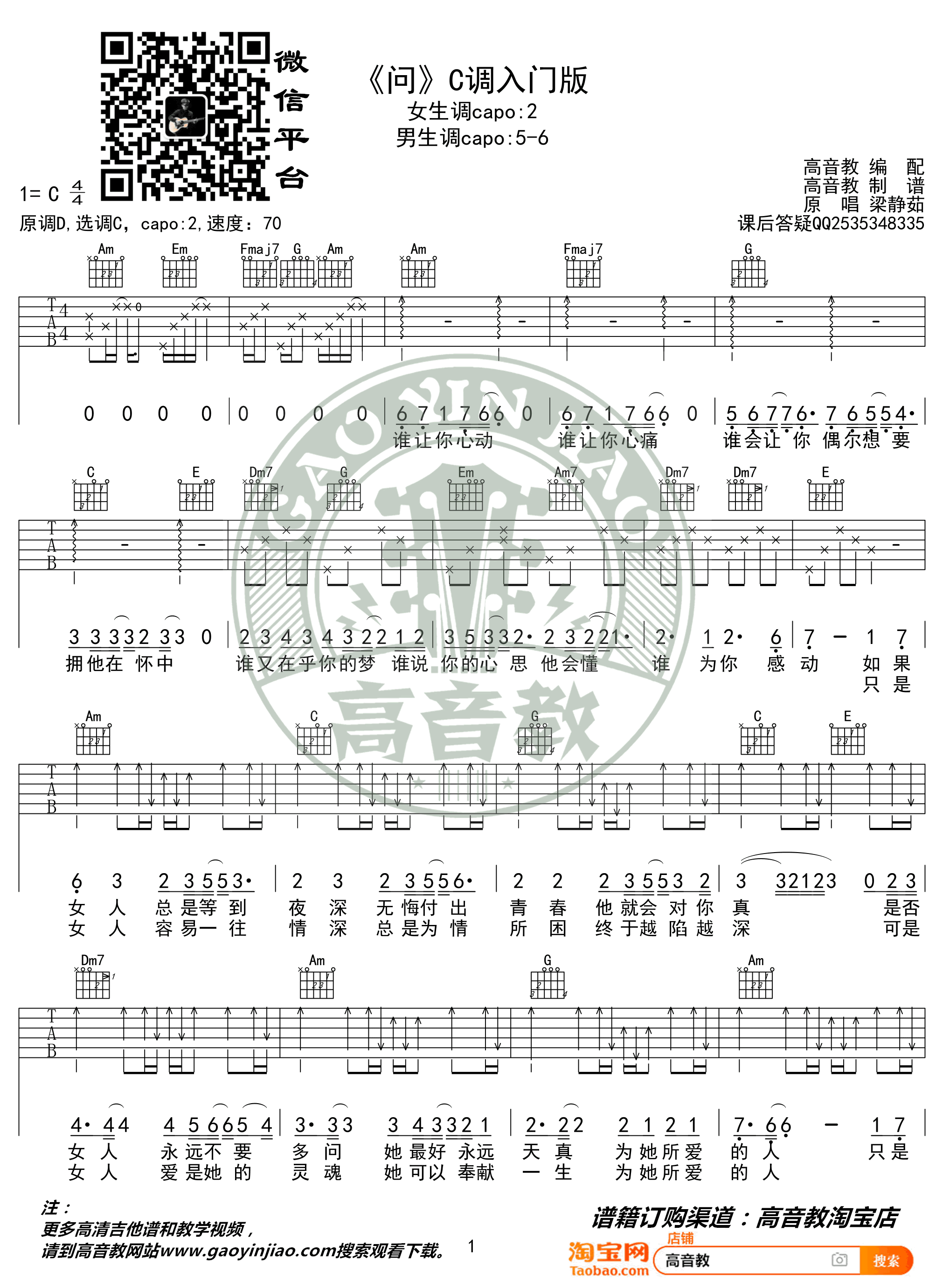 曲谱介绍: 《问》吉他谱,梁静茹演唱,李宗盛词曲的一首经典情歌,原唱是陈淑桦,问六线谱,歌曲原调D,选用C调指法,变调夹夹二品,女生调建议5-6品,高清弹唱图片谱,高音教入门版编配,吉他源更新分享。