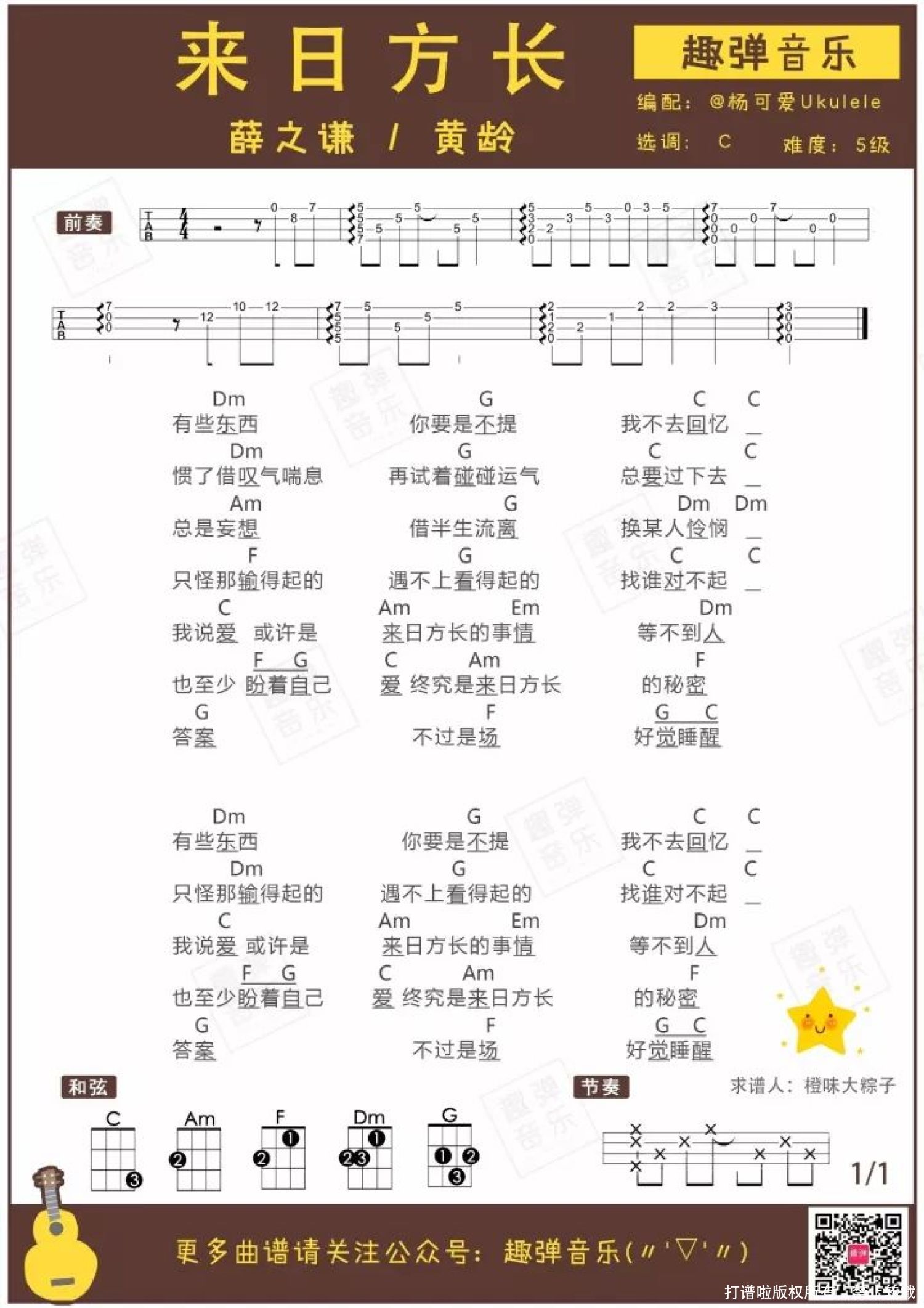 曲谱介绍: ● 电影《我不是潘金莲》的推广曲,薛之谦、黄龄演唱。 ● 2016年9月24日,该歌曲获得全球中文音乐榜上榜第十位。 《来日方长》MV沿用了电影《我不是潘金莲》中韵味十足的圆形画幅,而圆形画幅不仅是一次技术的尝试,其背后另有含义,方圆之间似真似幻,暗喻“镜花水月”更与歌曲气韵如出一辙。 这首歌细腻而温暖,轻呢而悠然,弥漫着缓缓时光的醇静味道。   弹唱曲谱