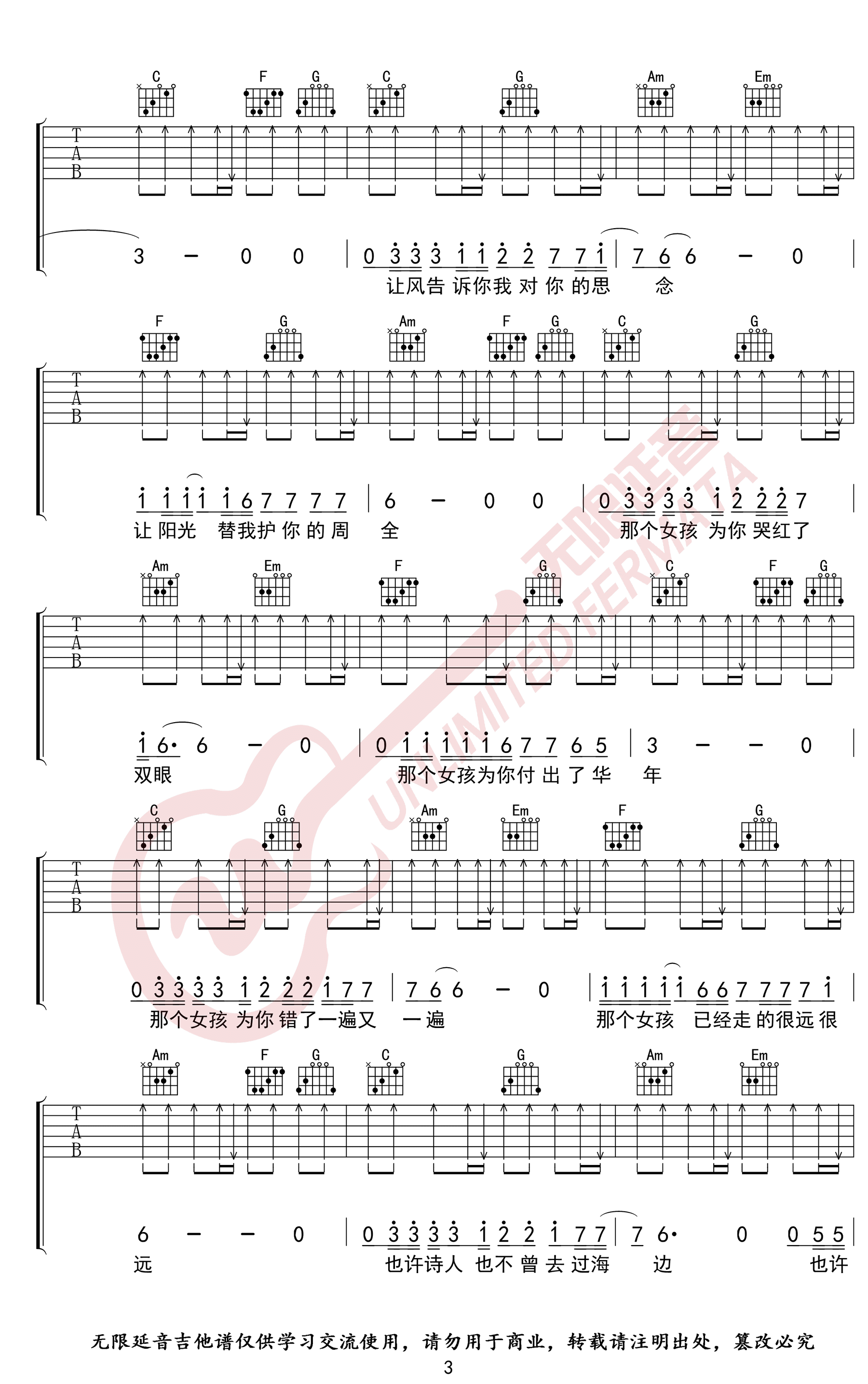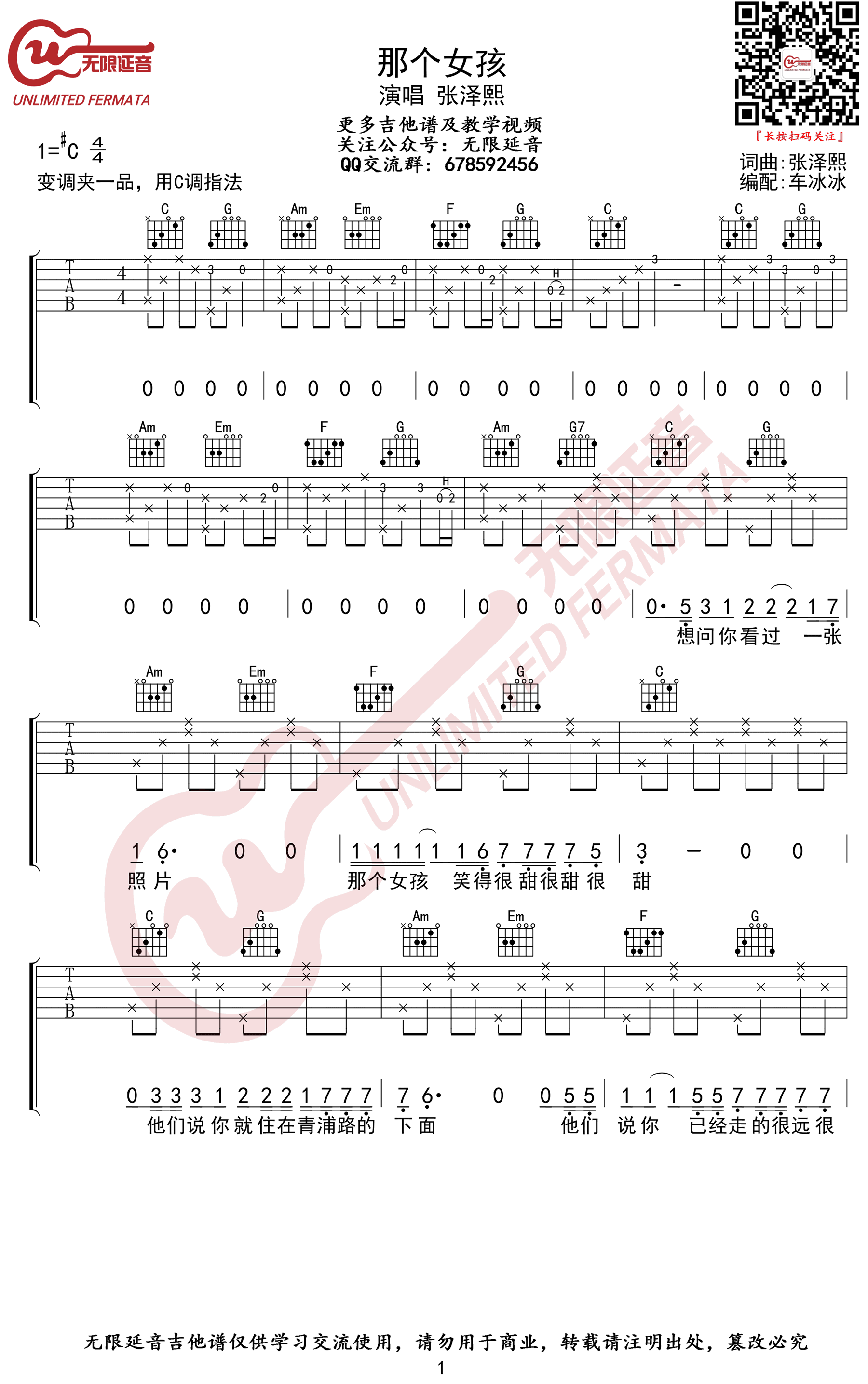 曲谱介绍: 《那个女孩》吉他谱,张泽熙演唱,原调#C,变调夹夹一品,用C调指法,那个女孩六线谱,高清完整版共四张弹唱图片谱例。无限延音编配,吉他源整理分享。