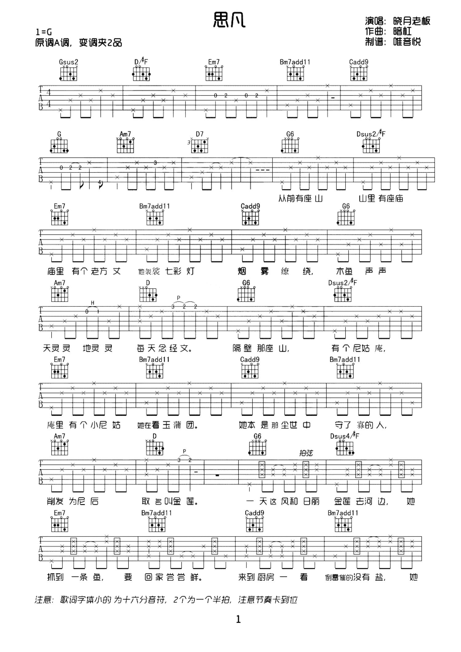 思凡吉他谱 - 晓月老板 - G调吉他弹唱谱