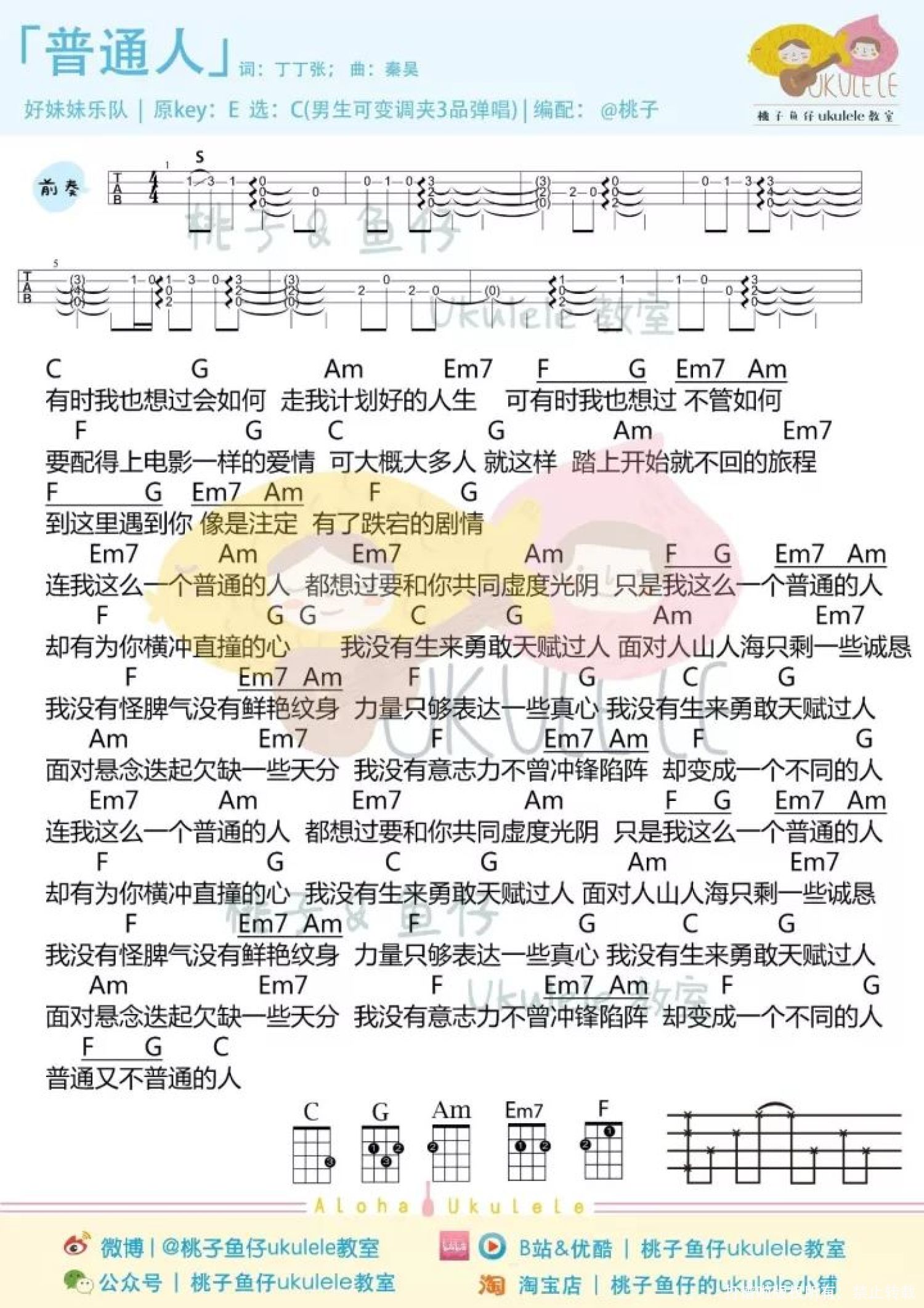 曲谱介绍: ▌《普通人》是好妹妹乐队秦昊作曲,丁丁张作词,好妹妹乐队演唱的一首歌曲。 该曲目是电影《横冲直撞好莱坞》的主题曲,由钟汉良首唱,后由原曲作者好妹妹乐队重新演绎。 ▌好妹妹乐队延续以往的暖心旋律,搭配丁丁张的词“只是我这么一个普通的人,却有为你横冲直撞的心”素朴却动人心弦,是一道可口的音乐美味。也许你我皆是普通人,但总有孤注一掷的理想。而正是这份“面对人山人海只剩一些诚恳,力量只够表达一些真心”更显得难能可贵。好妹妹乐队一路的“不信邪”挑战,也是秦昊和张小厚两个“普通人”的横冲直撞之旅。两个音乐门外汉“横冲直撞”音乐圈,又跨界影视圈,从《何以笙箫默》、《栀子花开》到如今的《横冲直撞好莱坞》,哪里有青春的气息,哪里就有好妹妹乐队。他们已然成为青春的代“乐”人。唯有少年,自在如风。   普通人 尤克里里谱