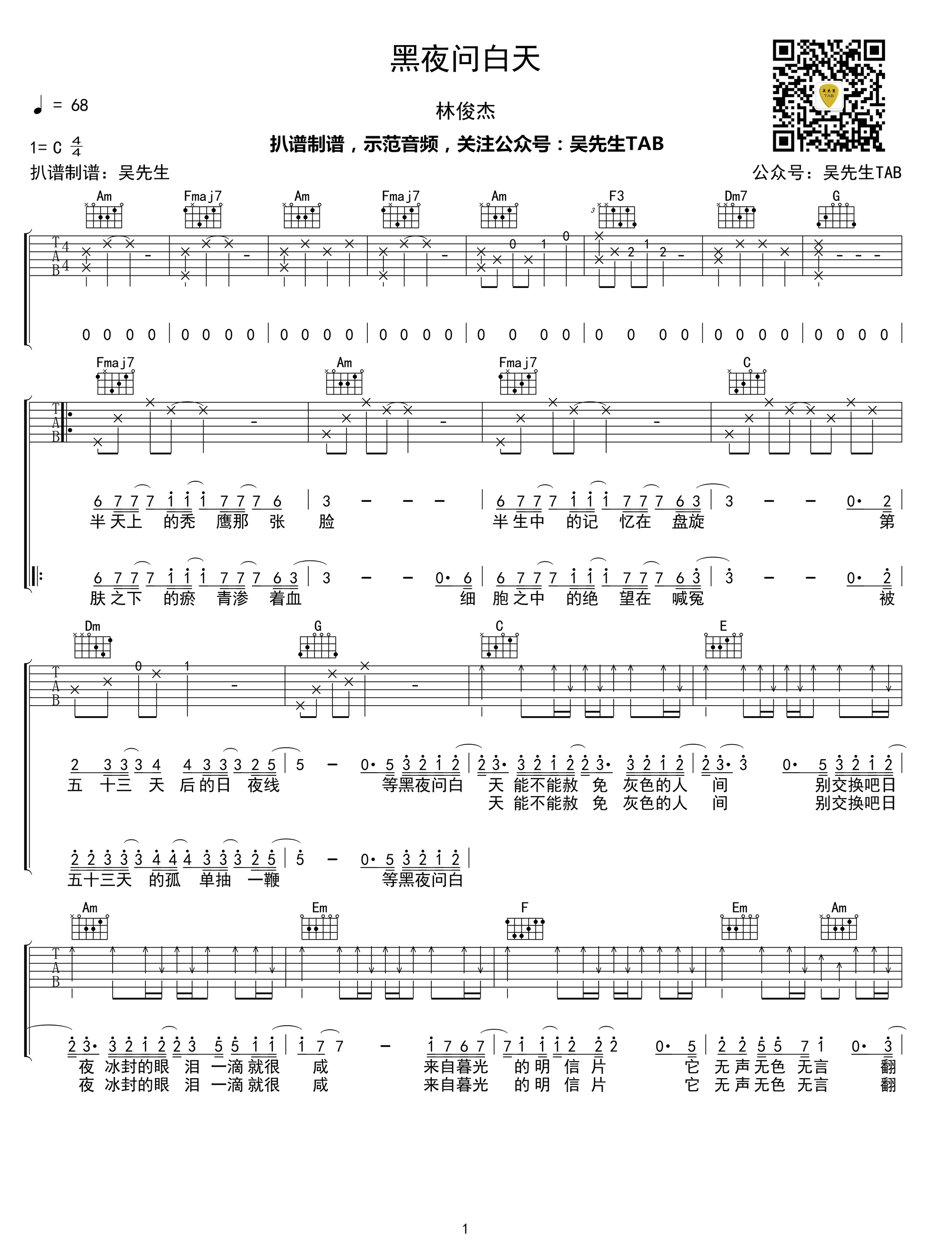 曲谱介绍: 《黑夜问白天》吉他谱,林俊杰演唱,黑夜问白天六线谱,C调弹唱谱,三张高清图片谱。吴先生扒谱编配,吉他源更新分享。 整首歌并没有直接地喊「痛」,却也能让人感受到深入骨髓的真实痛感,这就是林俊杰的音乐,每个听众都能从中看到自己的故事,也获得些什么。