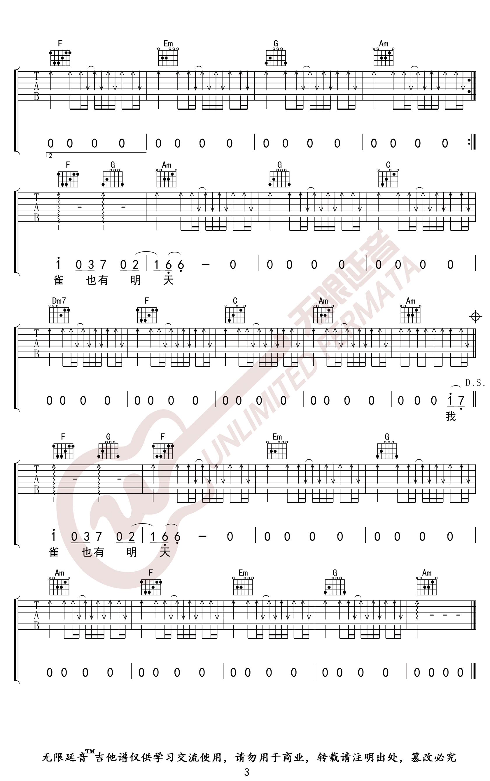 曲谱介绍: 《麻雀》吉他谱,李荣浩词曲演唱的一首新歌,原调F,变调夹夹五品,选用C调指法。麻雀六线谱,三张弹唱图片谱。无限延音编配出品,吉他源更新分享。