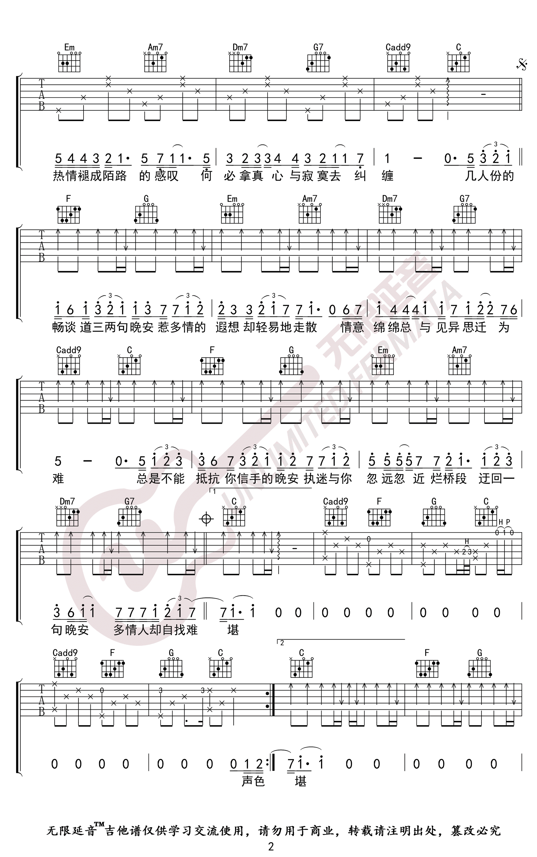 曲谱介绍: 晚安吉他谱,颜人中演唱的一首代表歌曲,晚安六线谱,C调指法编配,三张高清图片谱。无限延音编配出品,吉他源整理分享。