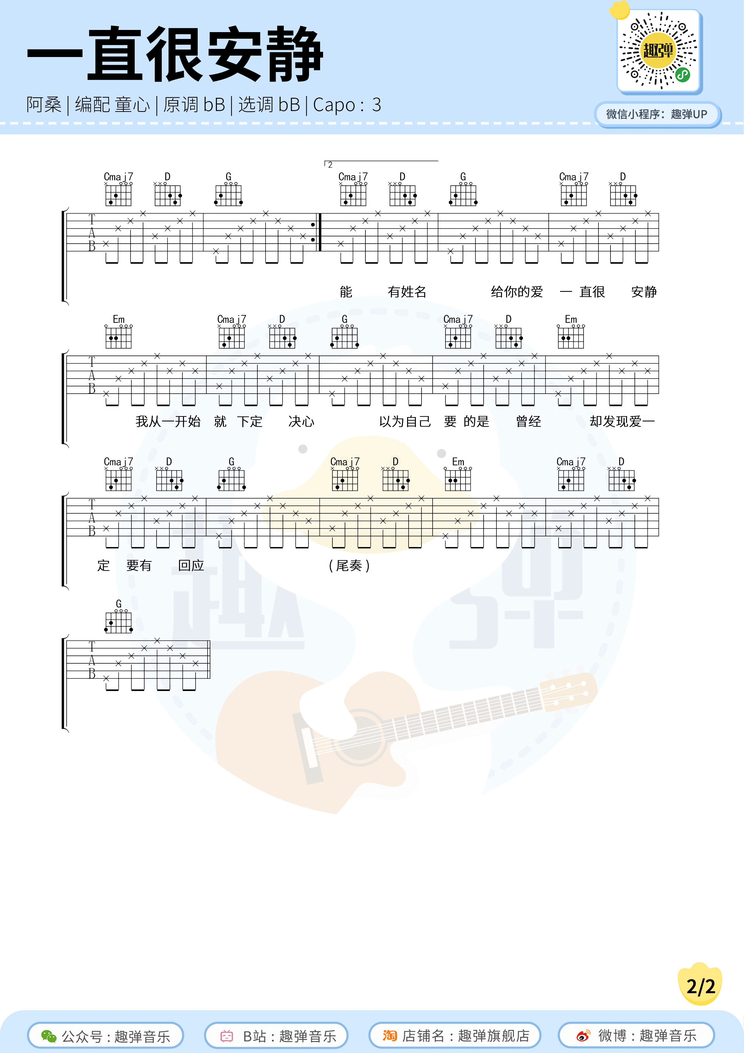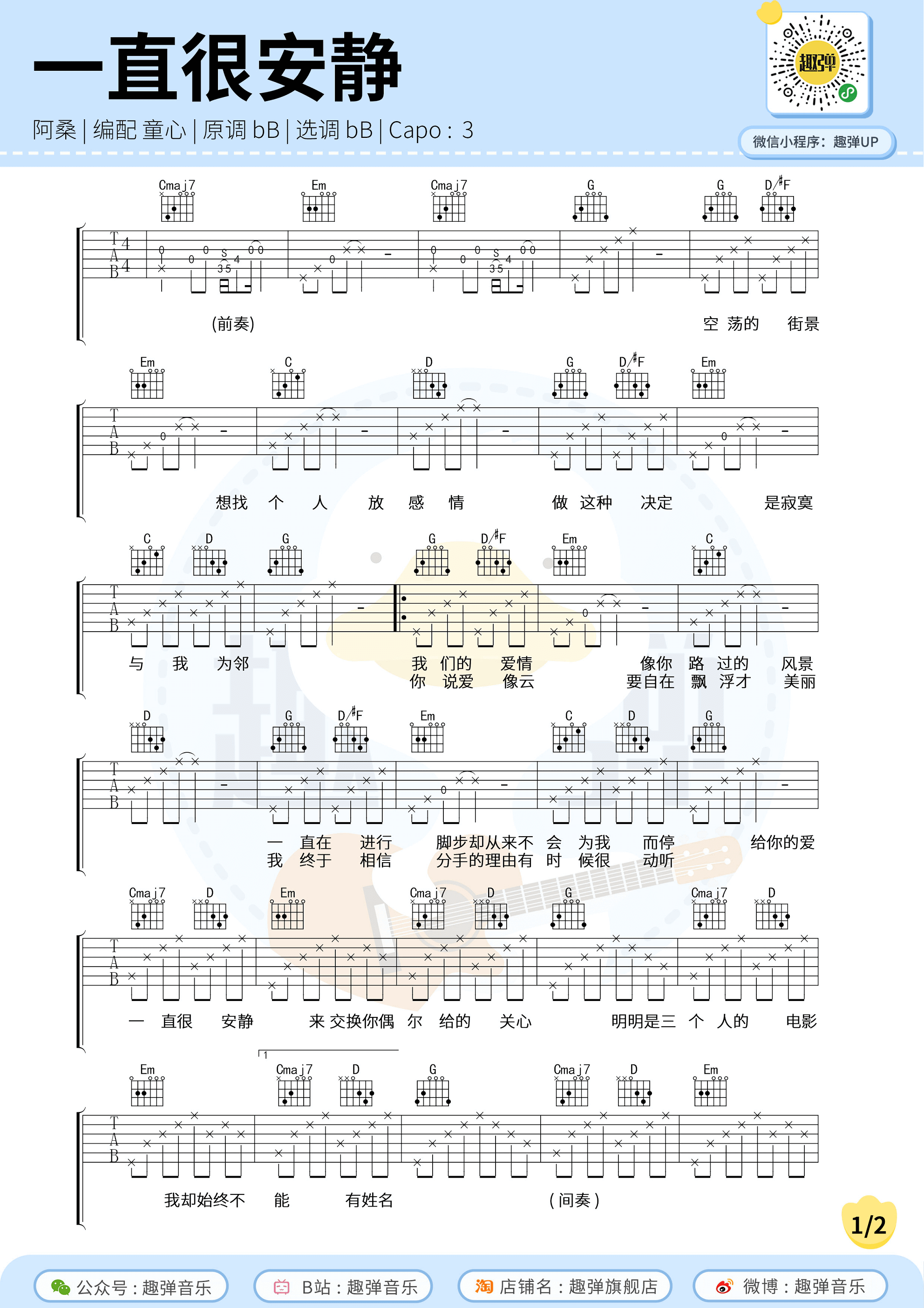 曲谱介绍: 《仙剑》的插曲《一直很安静》,这部剧也成为无数人少年时美好的经典回忆。今天分享的是《一直很安静》的吉他谱,来自趣弹音乐编配。这首歌原调是bB调,选调也是bB调,如果是女生的话建议变调夹夹5品位置,男生推荐夹3品位置。 吉他弹唱演示及视频教学