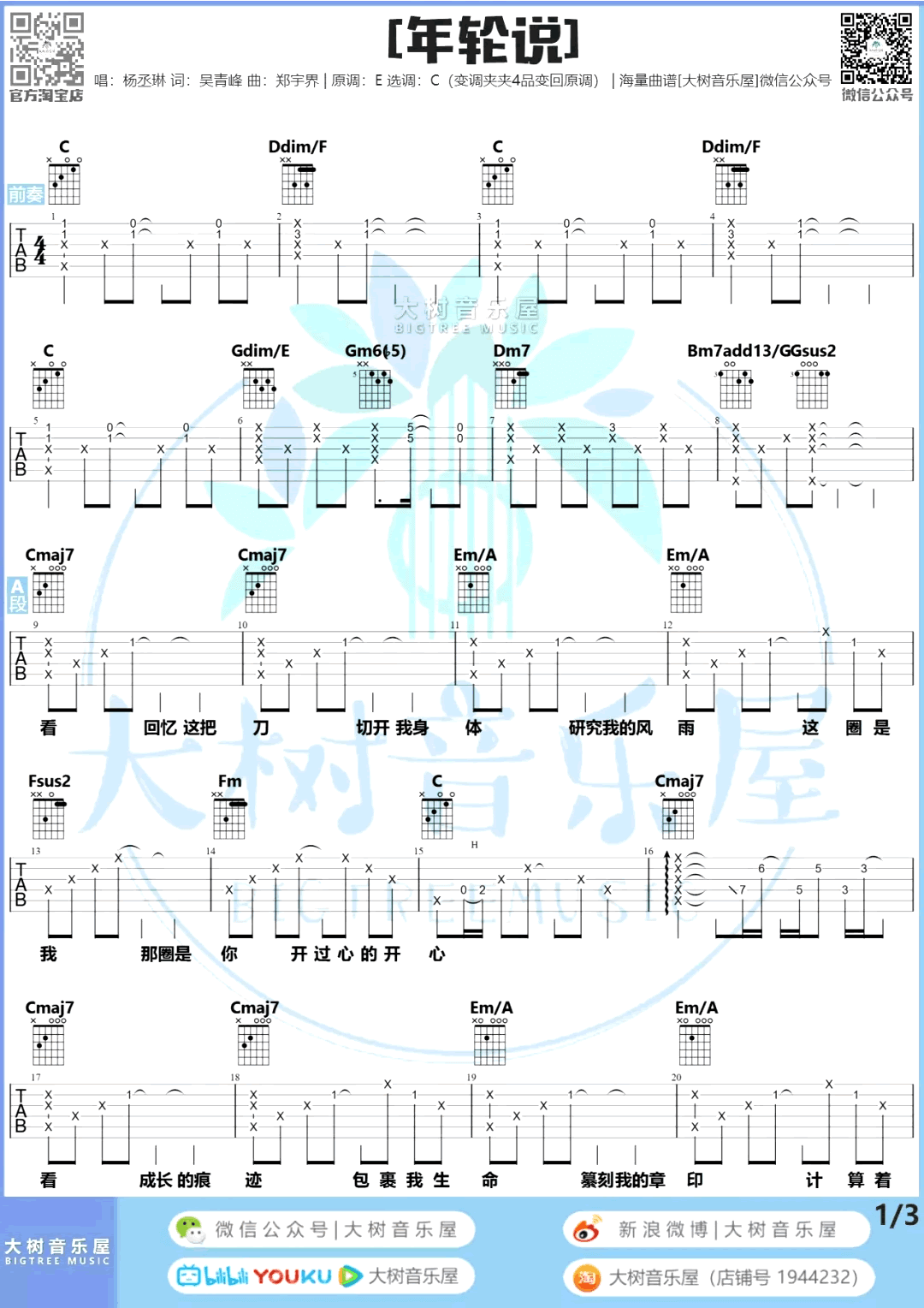 曲谱介绍: 杨丞琳《年轮说》吉他谱,原调E选调C,变调夹四品变回原调。年轮说吉他弹唱谱,根据吴青峰演唱版本改编的带前奏和弦图片谱,大树音乐屋编配,吉他源整理分享。 吉他弹唱演示及视频教学