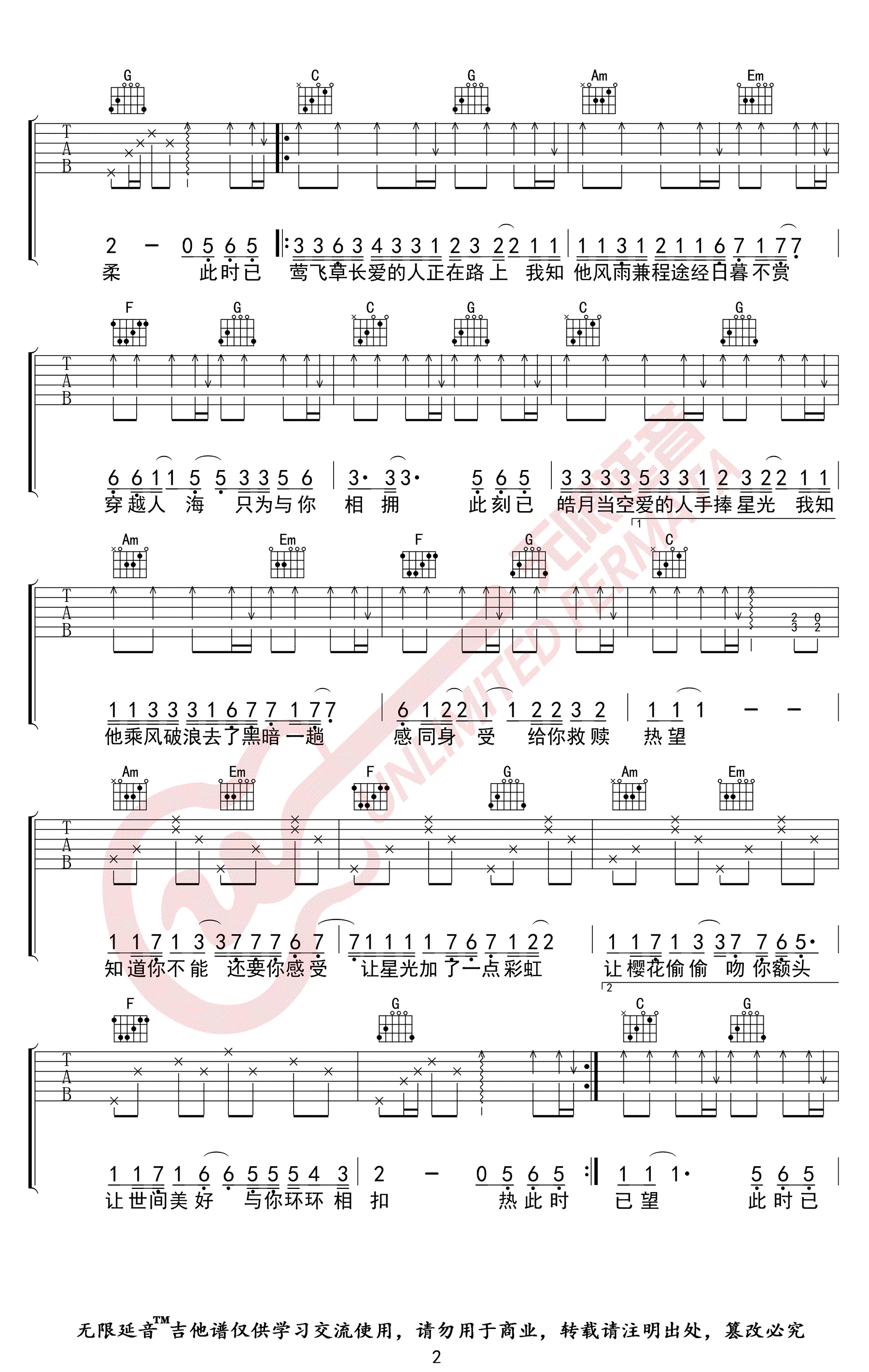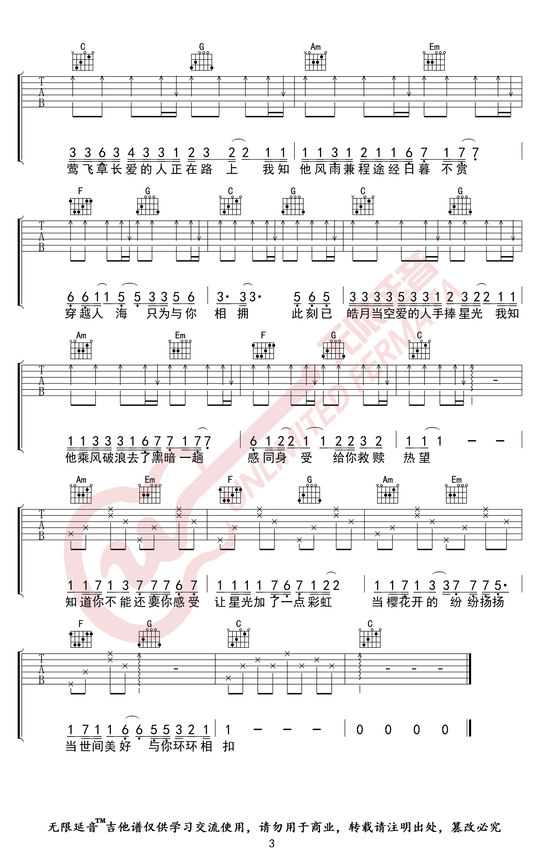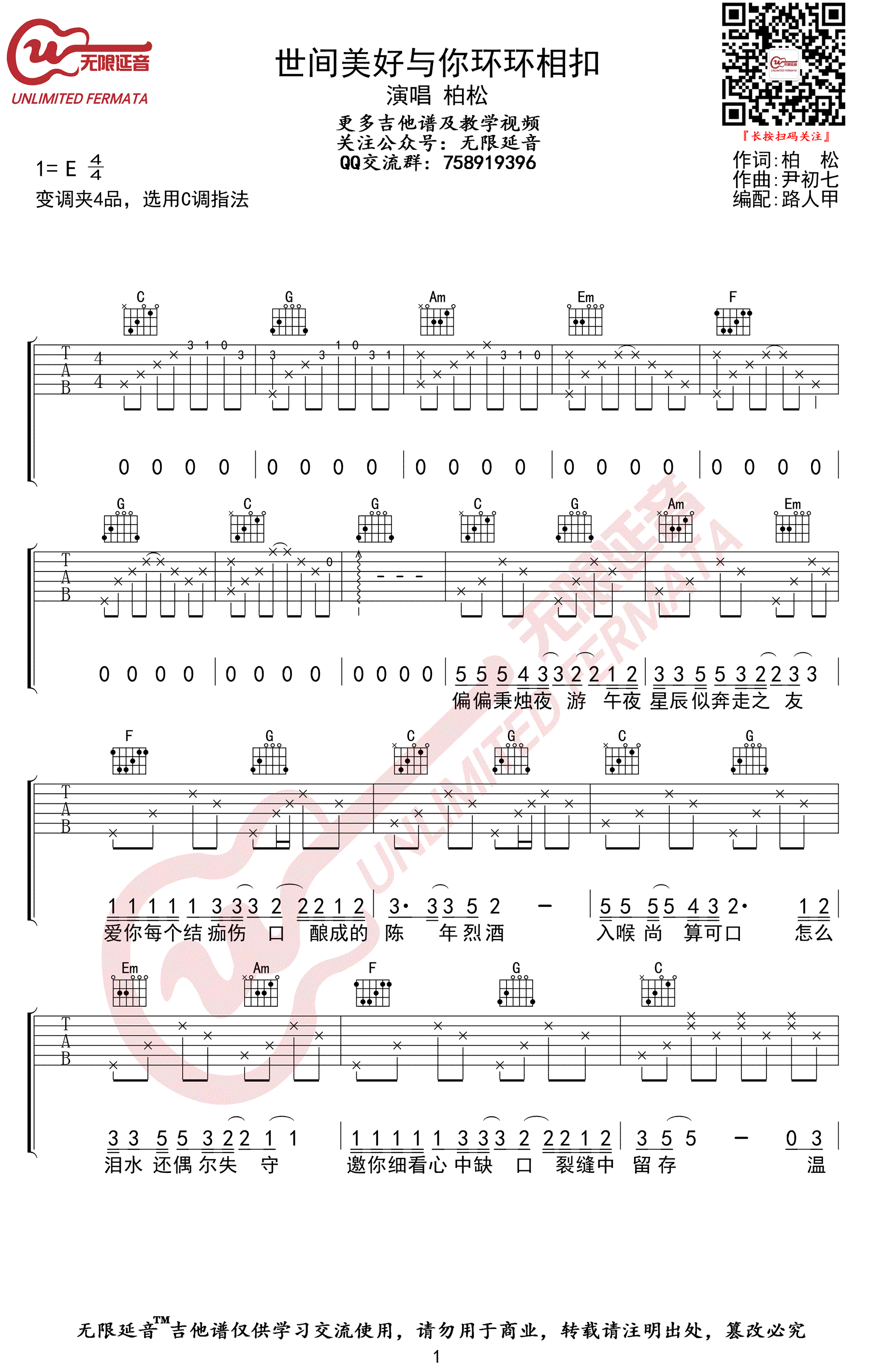曲谱介绍: 《世间美好与你环环相扣》吉他谱,柏松演唱,原调E,变调夹夹四品,选用C调指法,世间美好与你环环相扣六线谱,三张弹唱图片谱。无限延音编配分享.吉他源吉他谱上传更新。