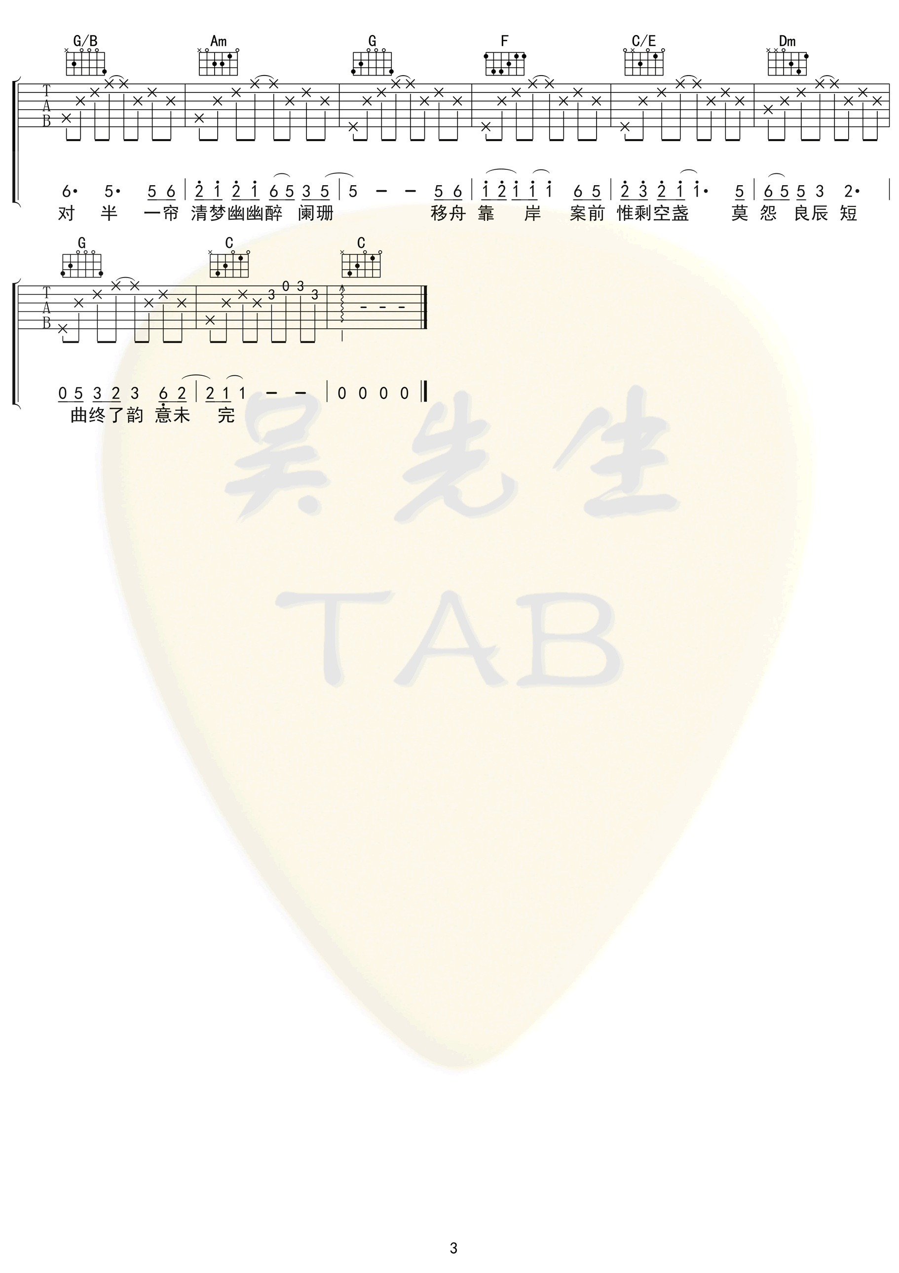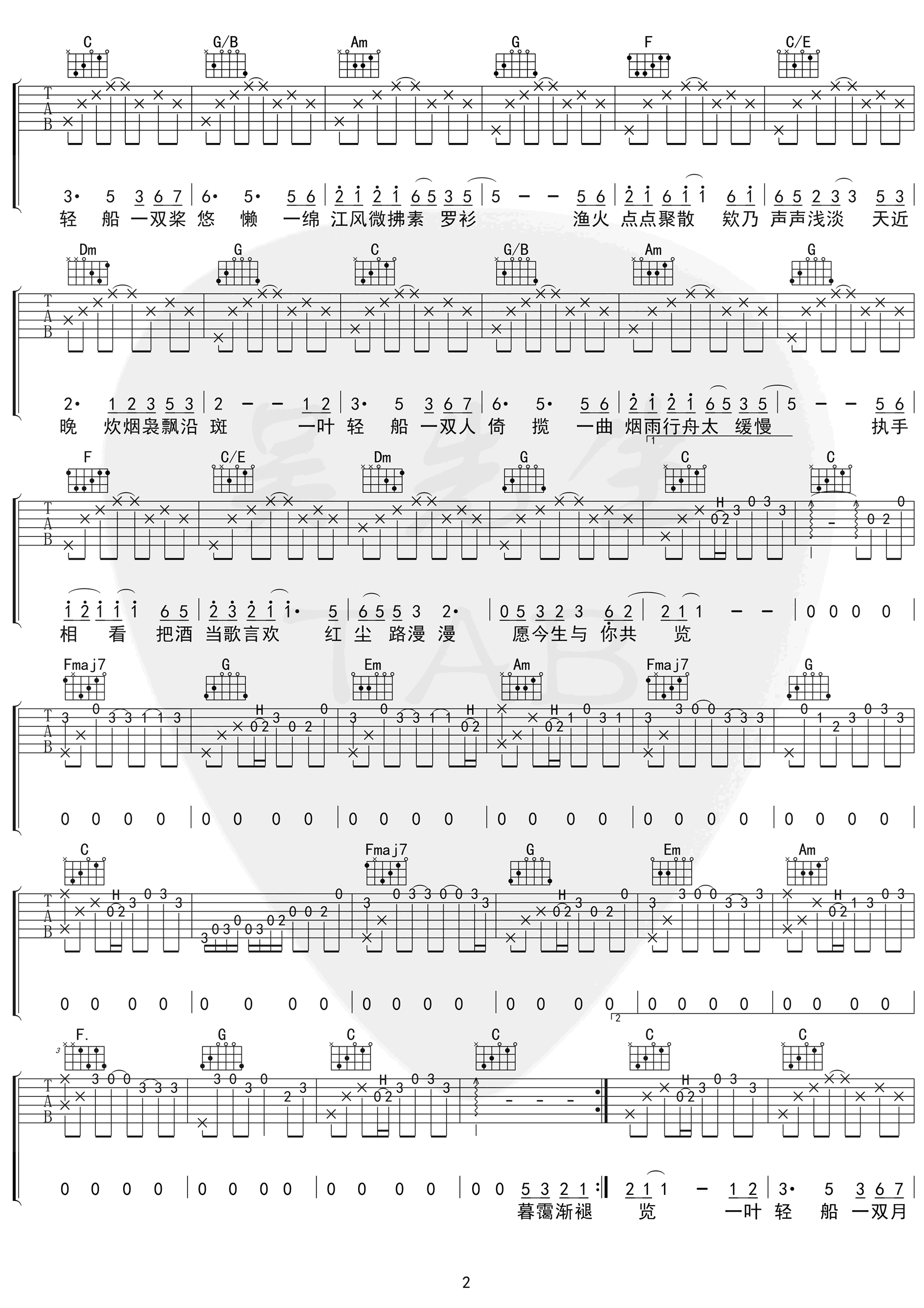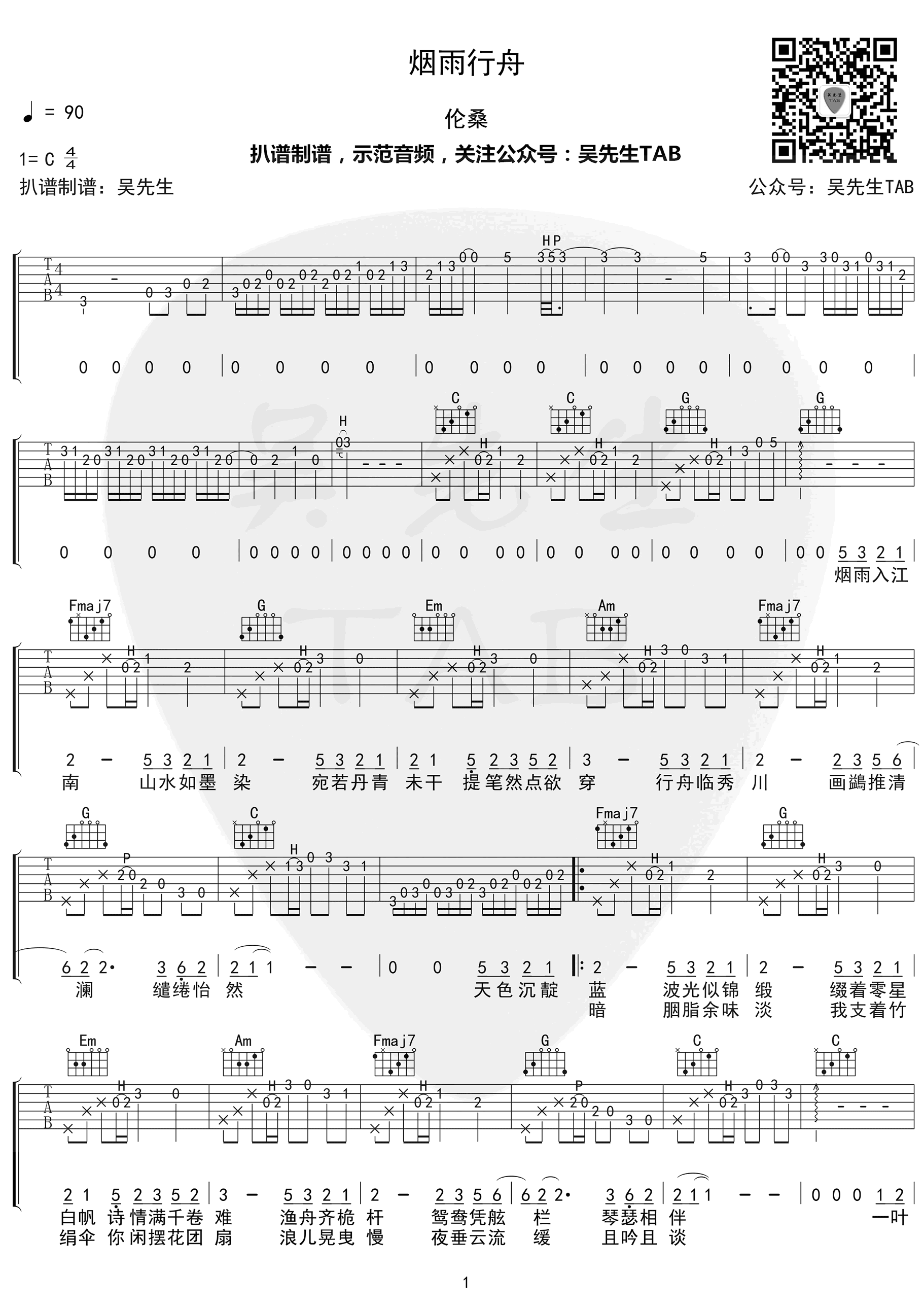 曲谱介绍: 《烟雨行舟》吉他谱,伦桑演唱的一首中国风歌曲,烟雨行舟六线谱,C调弹唱谱,三张高清图片谱。感谢吴先生编配,吉他源整理分享。 这一路上风景变幻,微风和煦,快到傍晚时船上渔火亮起,像星火点点聚聚散散,美景之下小情侣倚靠在一起当月上柳梢头时小船终于上了岸,桌上的小酒都饮尽了却还意犹未尽,不能怪良辰美景太短暂只能说这种美妙的心情一直萦绕在心头。–【文字编辑KH】 司南(女生)版本是A调。变调夹夹2品用G调指法是: 主歌:C–D–Bm–Em–C–D–G– 副歌:G–D/F#–Em–C–G/B–Am–D–G–