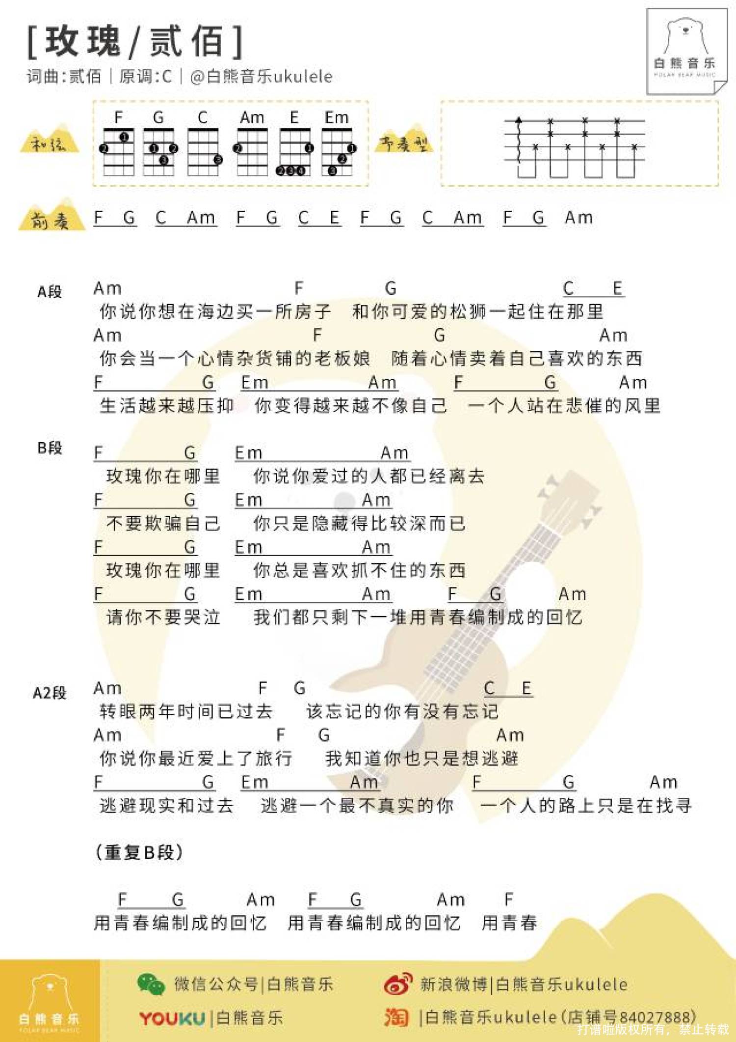 曲谱介绍: 贰佰《玫瑰》尤克里里谱
