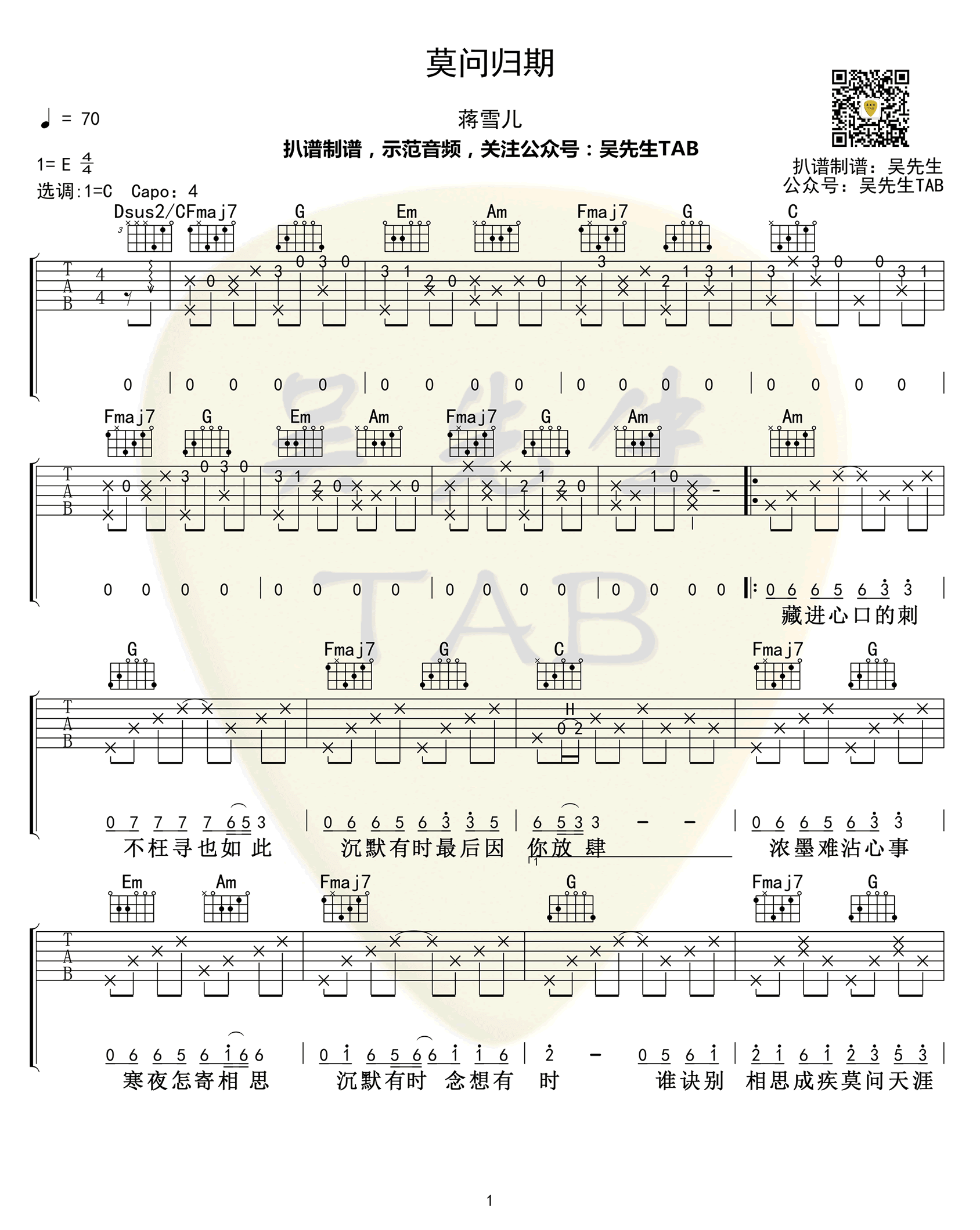 曲谱介绍: 《莫问归期》吉他谱,蒋雪儿演唱的一首古风歌曲,莫问归期六线谱,原调E选调C,CAPO夹第四品。三张高清图片谱。感谢吴先生编配出品,吉他源上传分享。