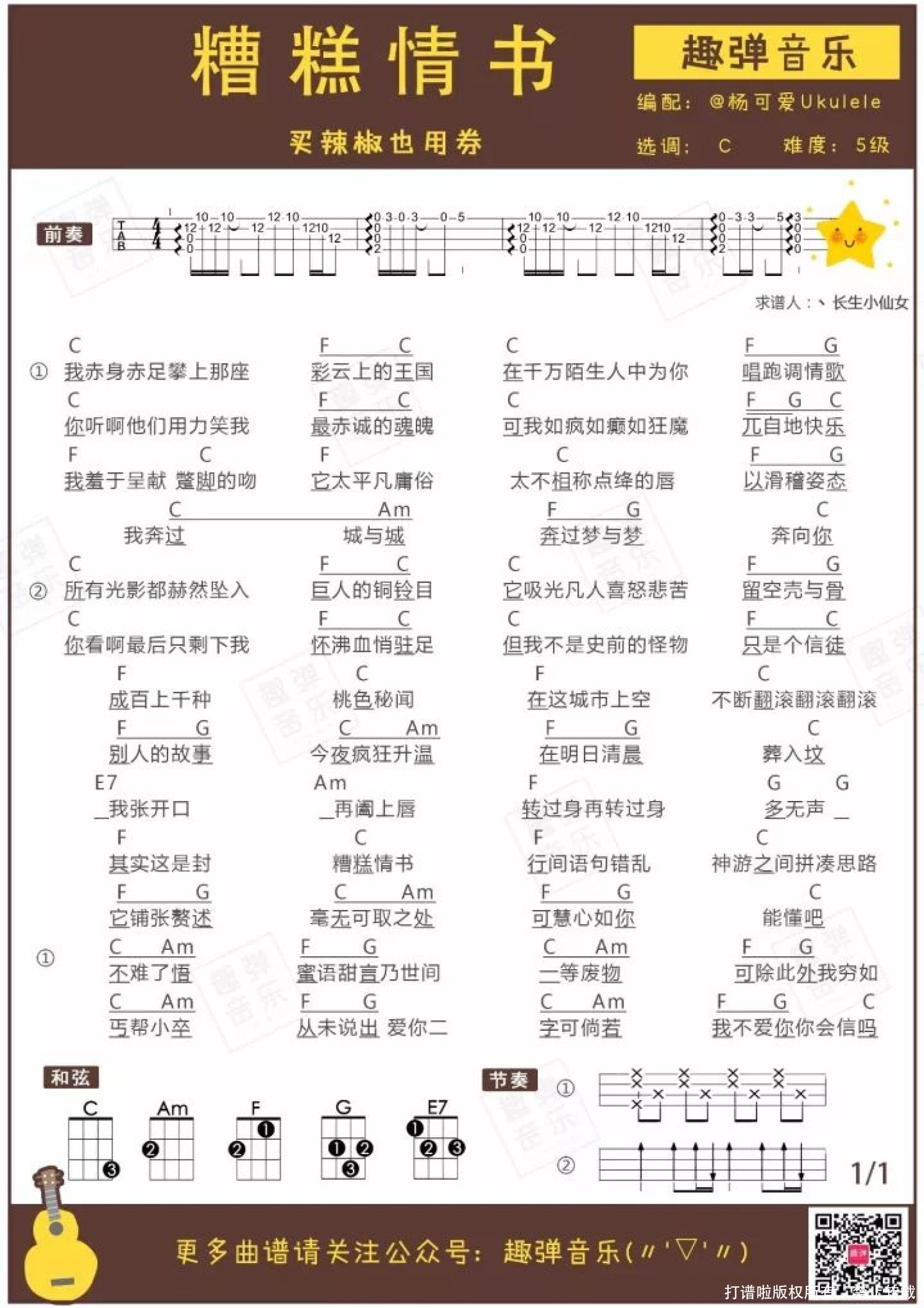 曲谱介绍: 看到“买辣椒也用券”这个歌手名的时候,灰子是懵比的…… 后来求助了万能的度娘,才知道这首《糟糕情书》是泰语歌《只有你》的中文填词版~ 泰语原曲是电影《暹罗之恋》的插曲。不论是泰语原曲还是中文版的《糟糕情书》,都一样深情动听~   弹唱曲谱