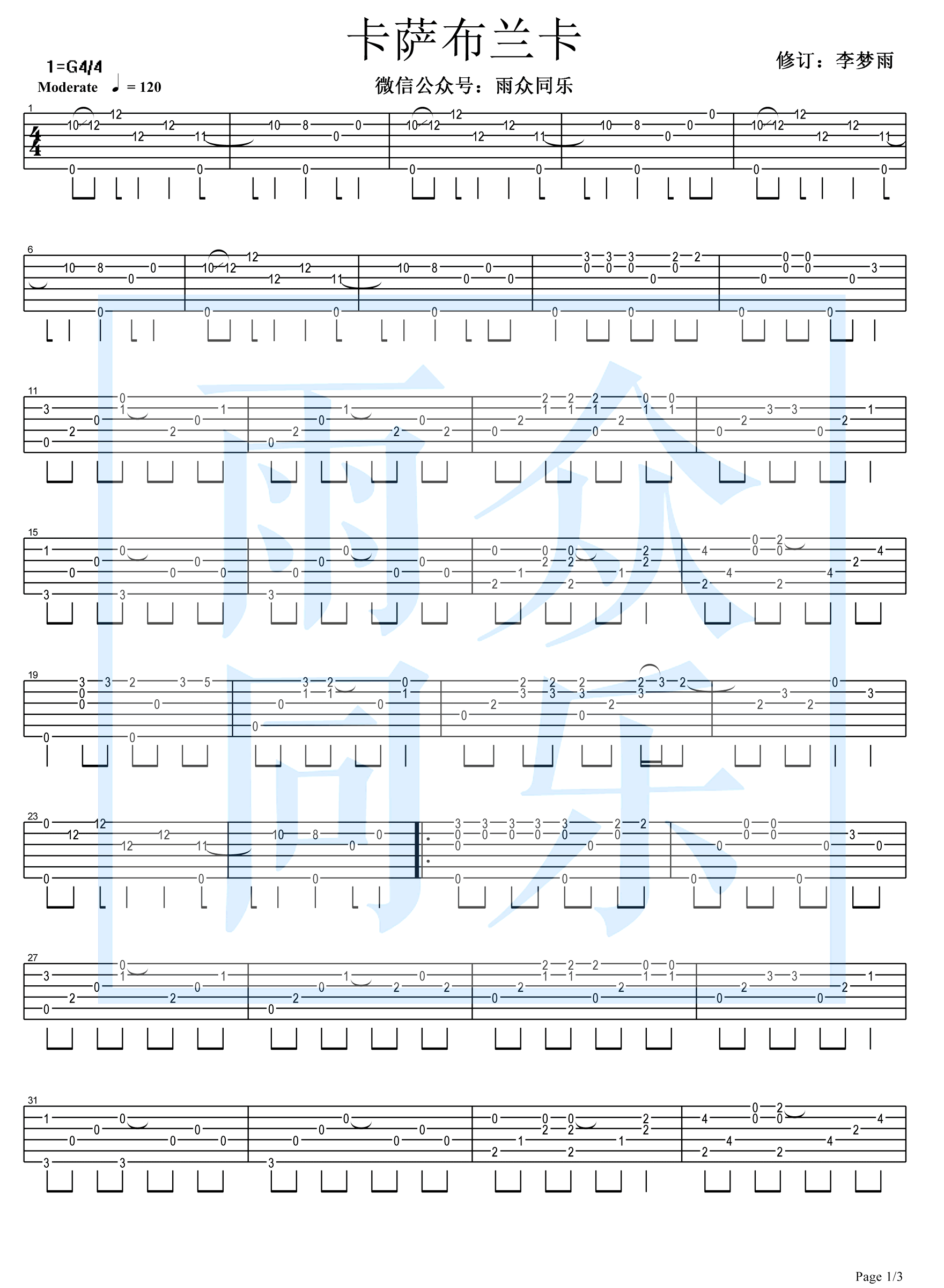 曲谱介绍: 卡萨布兰卡指弹谱,电影《北非谍影》主题曲,Casablanca吉他独奏谱,雨众同乐李梦雨修订,吉他源上传。这歌曲独奏谱子在网上搜的,就是修改了一下,如果有喜欢指弹独奏的朋友,可以多一首练习曲了。 《卡萨布兰卡》(CASABLANCA)是由Bertie Higgins填词和谱曲在1982年发行,由贝蒂·希金斯演唱的歌曲。是上世纪70年代由 Bertie Higgins在看完这部电影后有感而写出的,用的是电影的名字。 《卡萨布兰卡》之所以受人喜爱,是因为它唱出了许多无奈离别的人的心声。